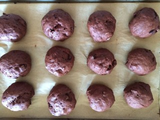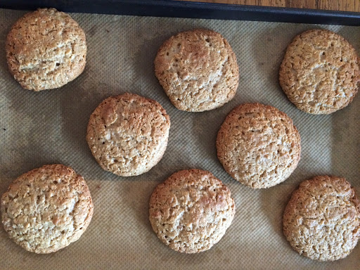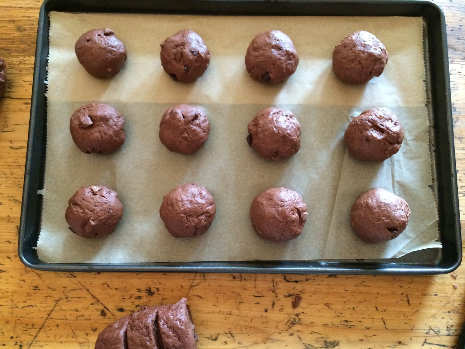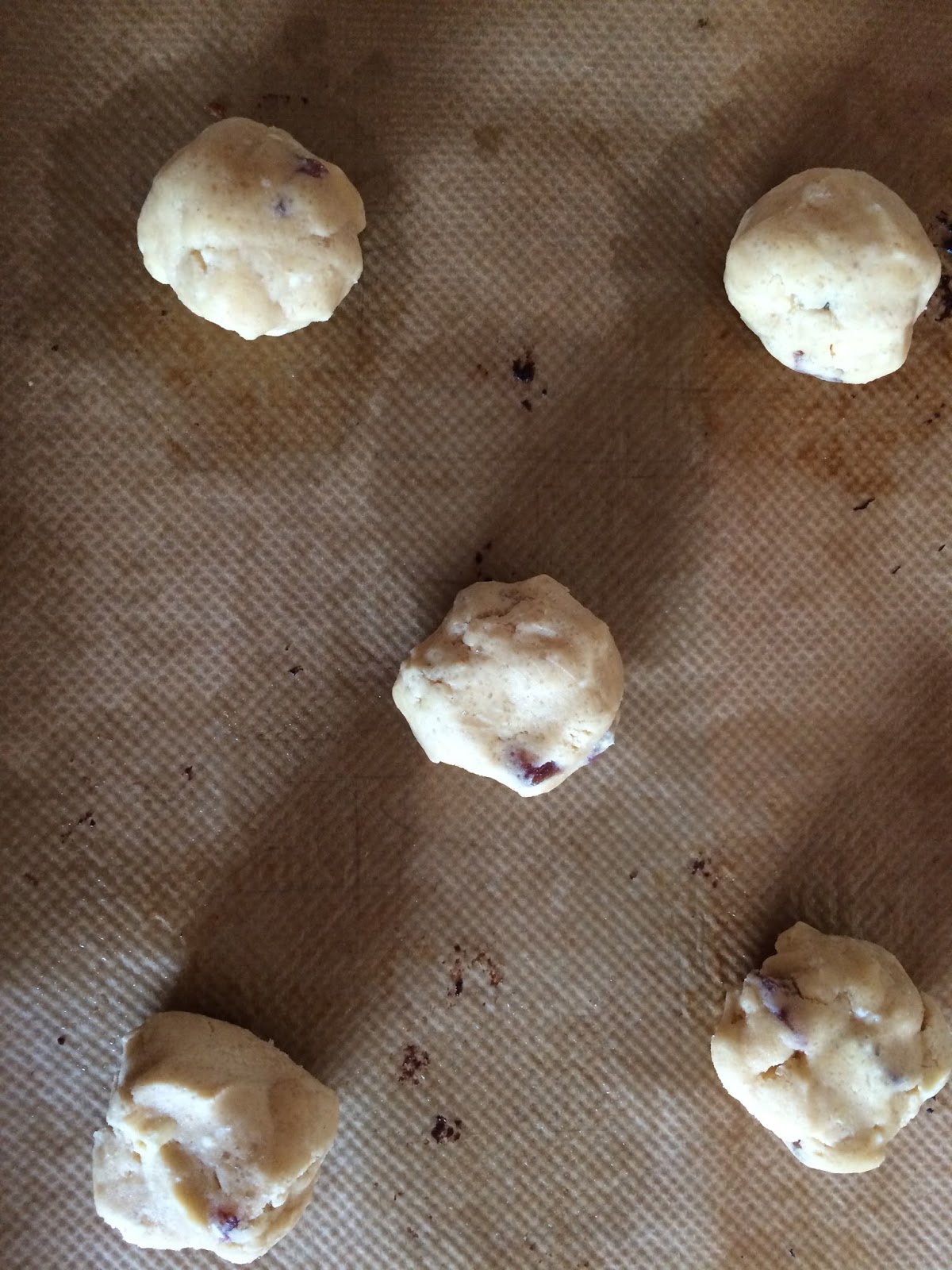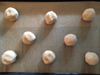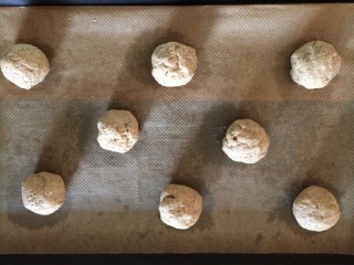 2 EL Teig zu Kugeln formen und auf ein mit Backpapier ausgelegtes Blech setzen (ca. 4 cm Abstand) und etwas (nicht zu viel!!) flach drücken.