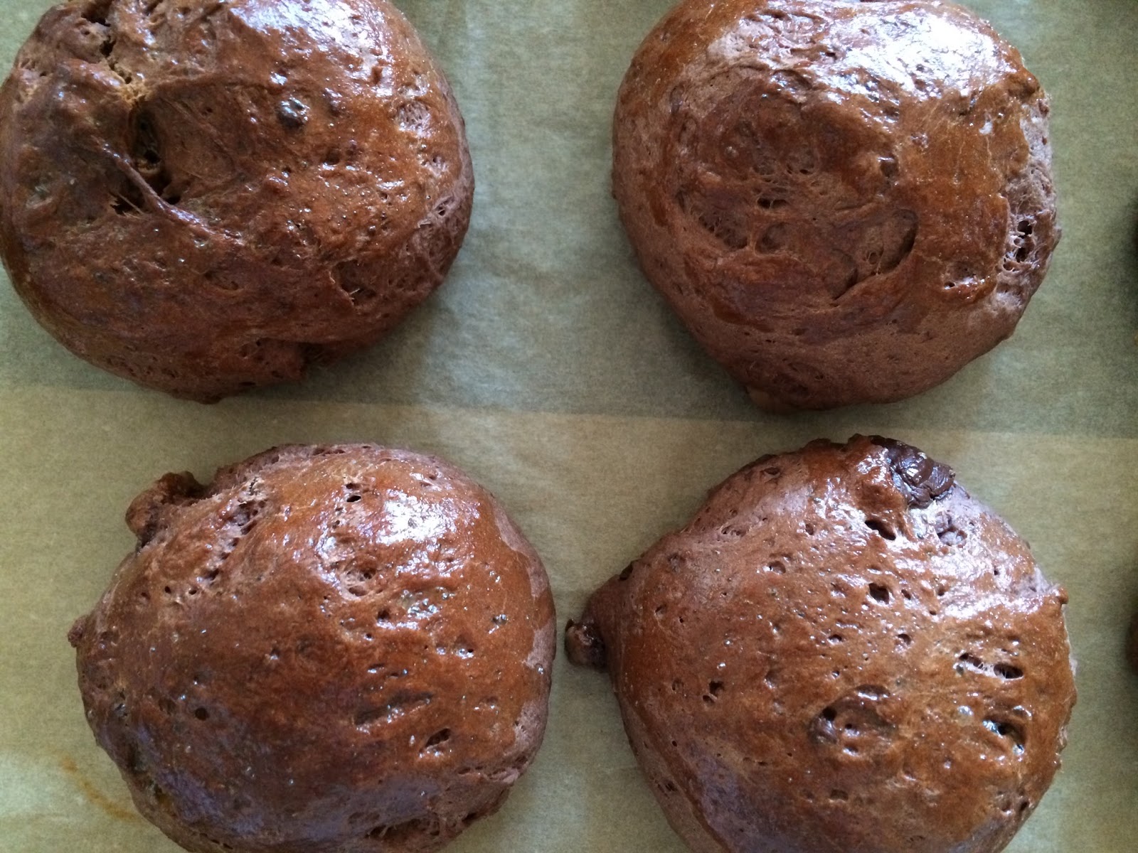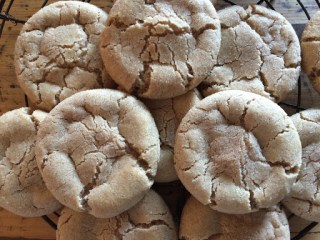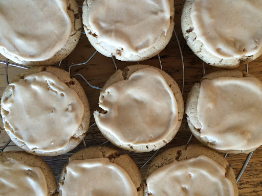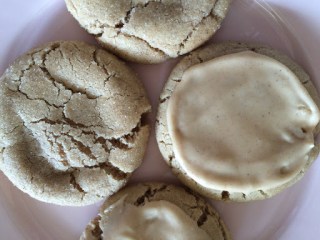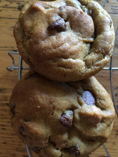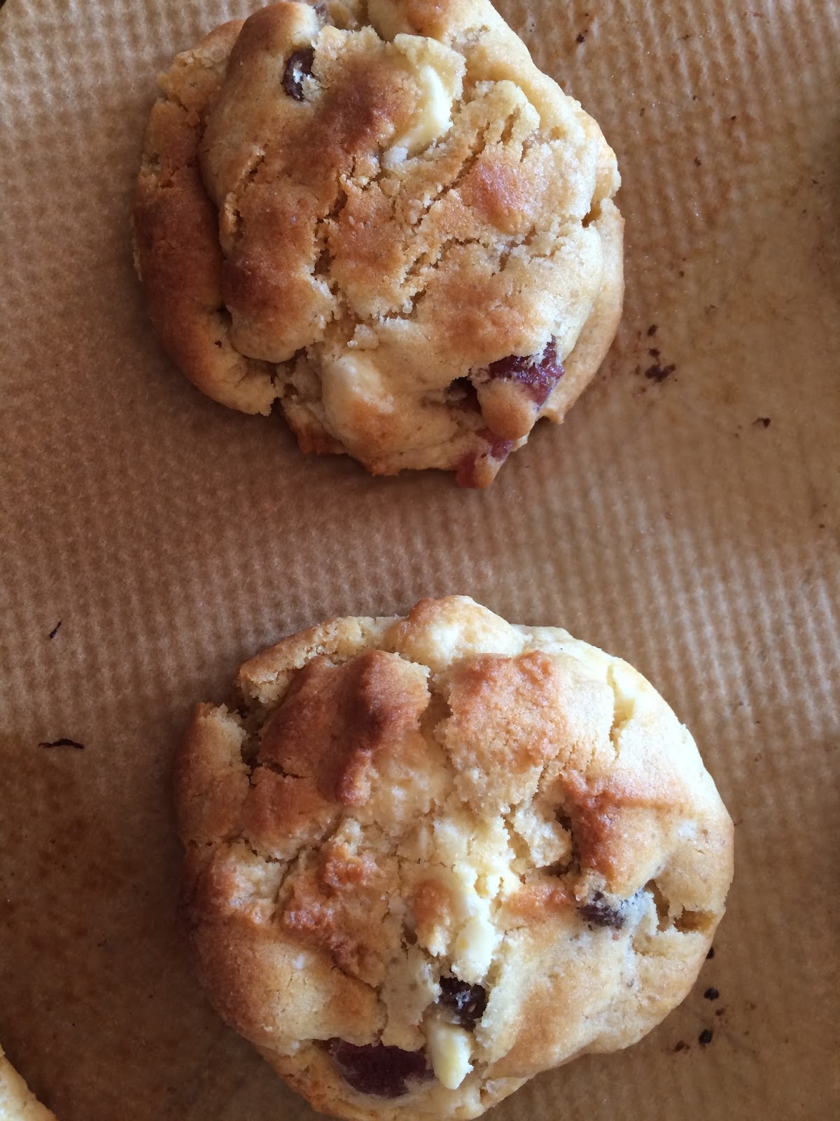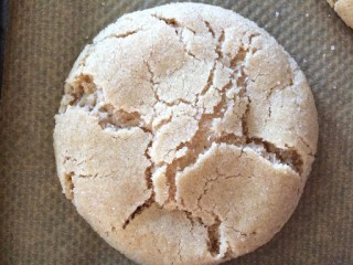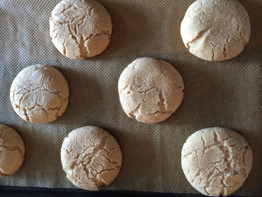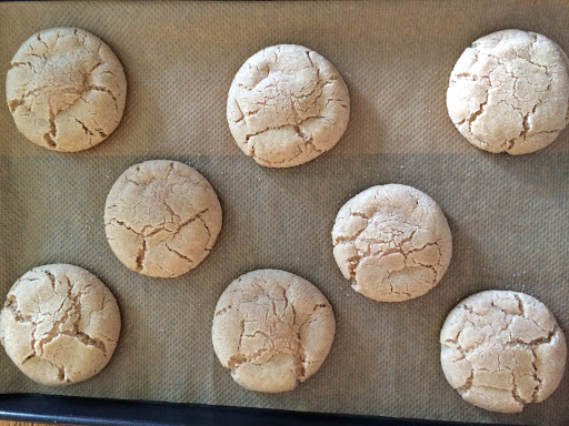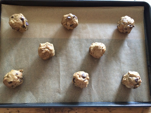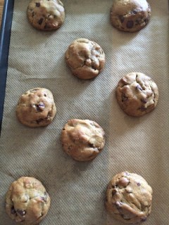 Im unteren Ofendrittel 9-10 Minuten backen. Nicht länger!! Die Cookies sehen noch nicht ganz fertig aus, sind es aber (erste Risse oder „crackles“ sollten zu sehen sein).