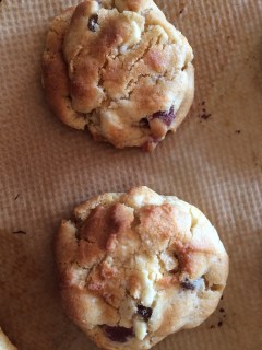 Für diese Cookies benutze ich getrocknete, gezuckerte Erdbeeren, die ich in kleine Stücke hacke. Falls ihr die nicht bekommt, könnt ihr auch getrocknete, kandierte Ananas oder jede andere Trockenfrucht zufügen. Alles, was ihr euch vorstellen könnt, wird schon schmecken! Ich nehme an Schokolade, was gerade da ist. Hier würde ich auf jeden Fall weiße Schokolade empfehlen – in nicht zu kleine Stücke gehackt. Ihr könnt auch Schokolade mit Kokoscrisp oder Oreos etc. nehmen.