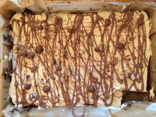 Für die Schokoladendrizzle das Öl in ein kleines mikrowellengeeignetes Plastikgefäß geben, die gehackte Milchschokolade dazugeben und auf halber Stärke in der Mikrowelle ca. 2 Minuten schmelzen lassen (immer mal wieder kontrollieren und umrühren). Dann mit einem Messer oder Löffel auf die Brownies drizzlen.