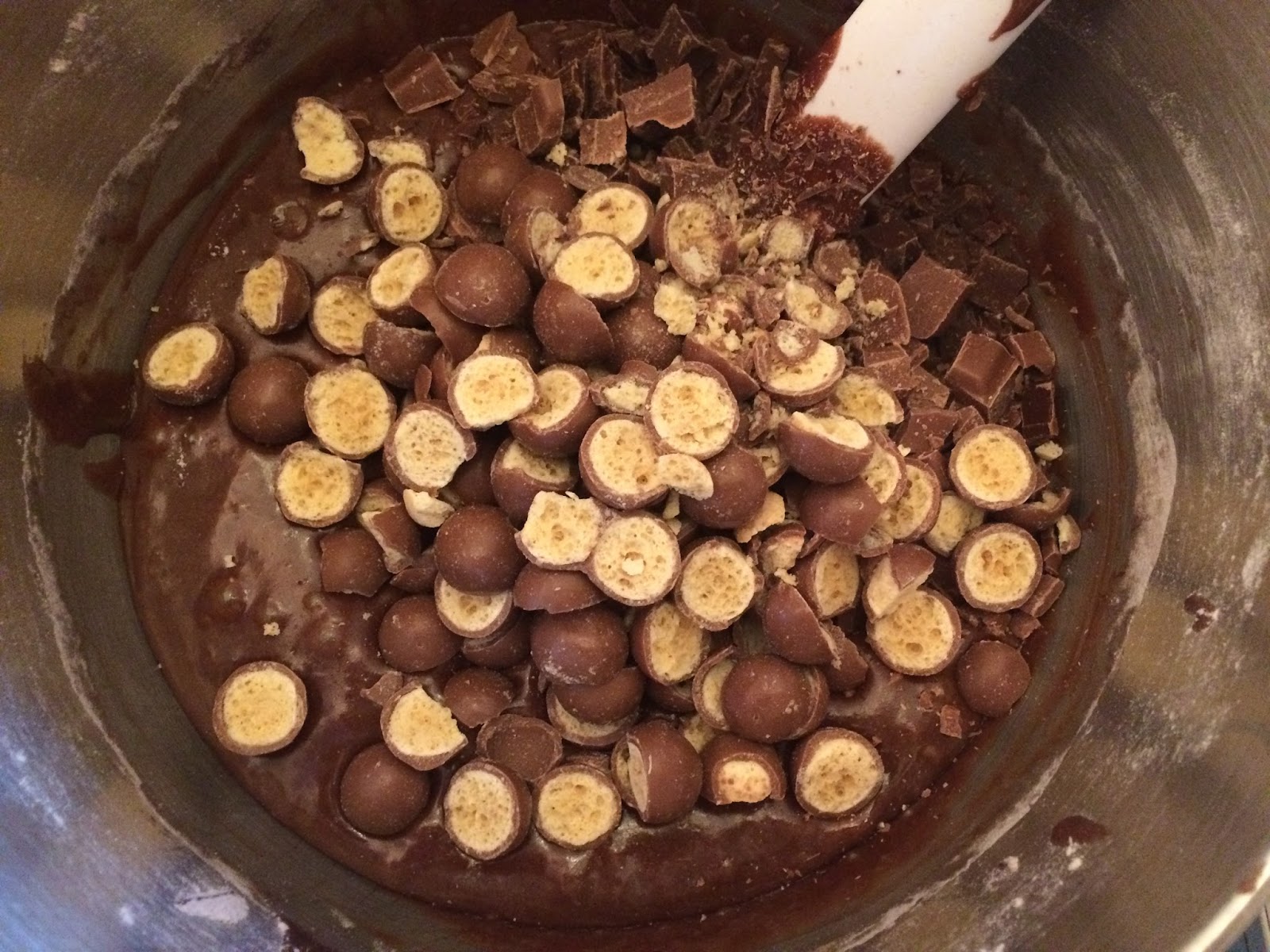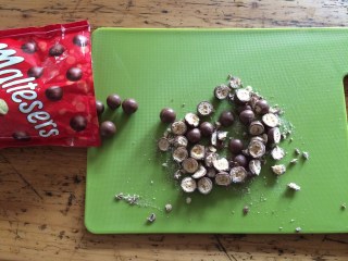 Die restliche Schokolade hacken und mit dem Großteil der Maltesers (eine knappe Handvoll für die Deko zur Seite legen) zum Teig geben.