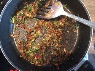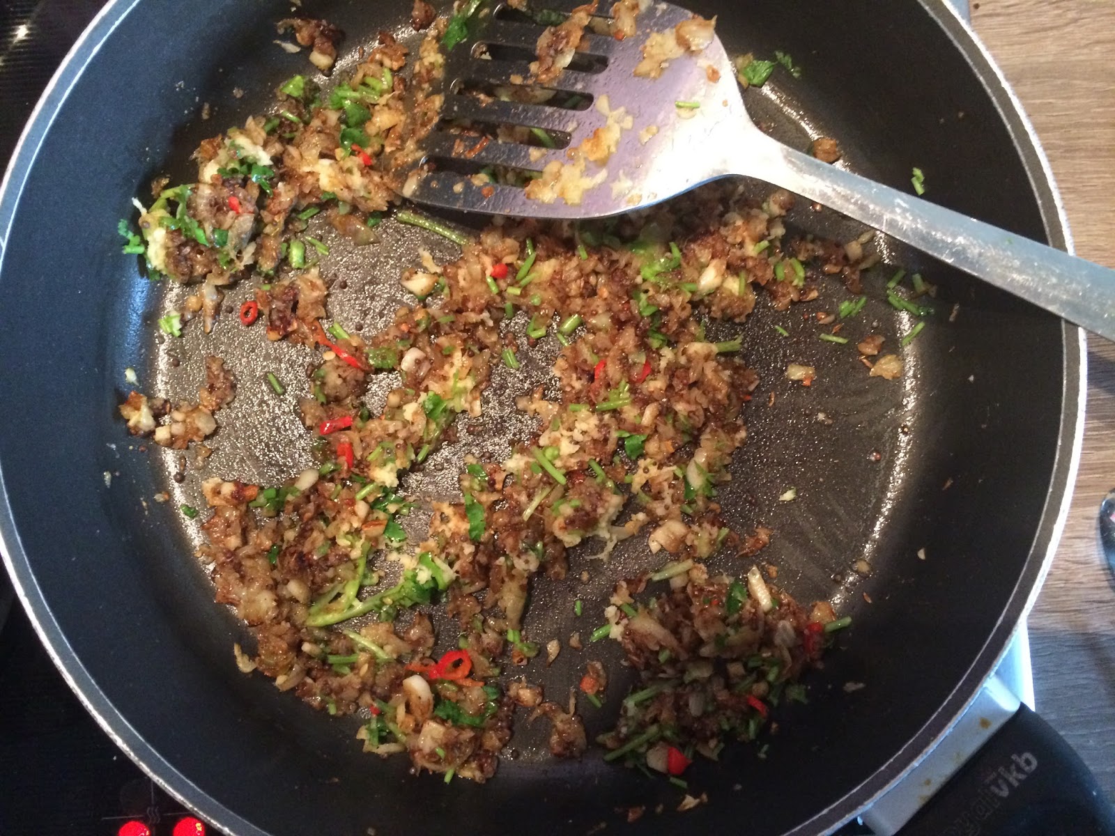 Zwiebeln hacken, Knoblauch fein reiben oder hacken.