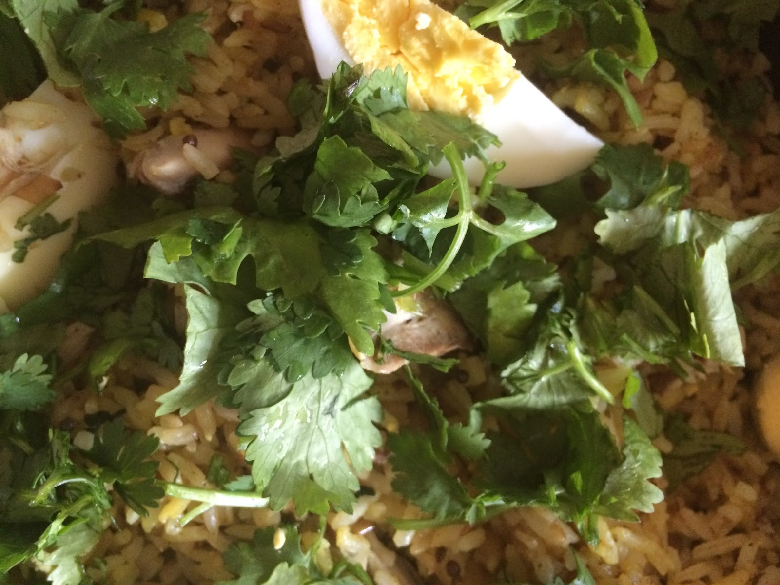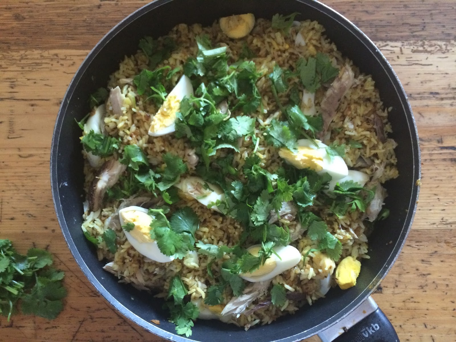 Wir brauchen Basmatireis, Bio-Eier, Zwiebeln, Knoblauch, Ingwer und Butter. Außerdem die üblichen indischen Verdächtigen: rote Chilischoten, Garam Masala, Kreuzkümmelsamen, schwarze Senfkörner und Kurkuma (gibt´s im Asialaden, aber inzwischen auch alles in den meisten Supermärkten). Dazu kommt noch eine ganze geräucherte Makrele, Lorbeerblätter, schwarze Pfefferkörner, Zitronen und jede Menge frischer Koriander. Zum Servieren noch Joghurt, Mango-Chutney und Naan-Brot – je nach Geschmack.