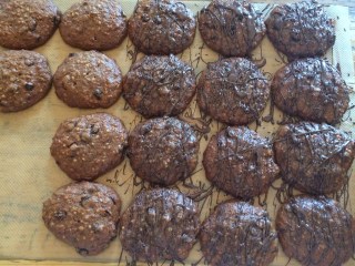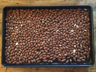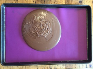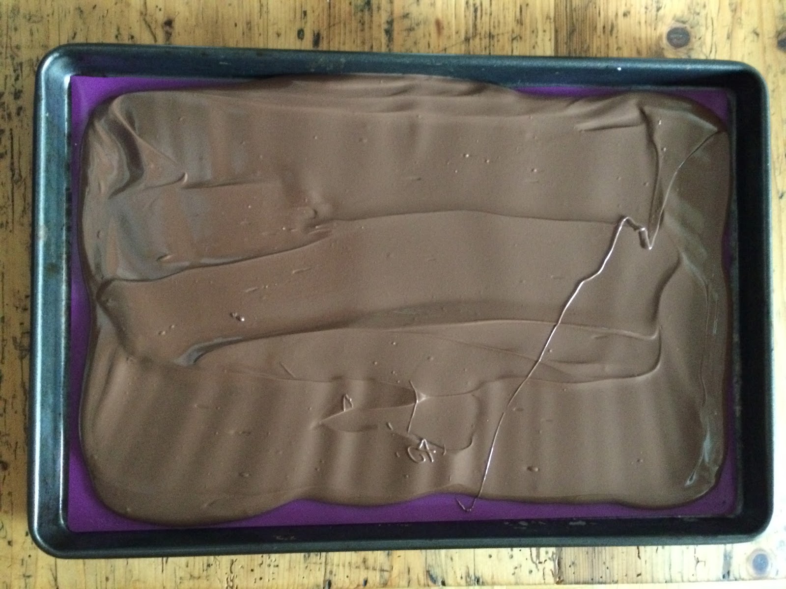 Immer mal wieder mit einem Gummi-Spatel umrühren. Während die Schokolade schmilzt ein Blech mit Backtrennpapier oder einer Silikonmatte auslegen.