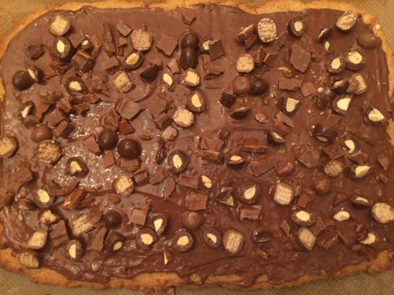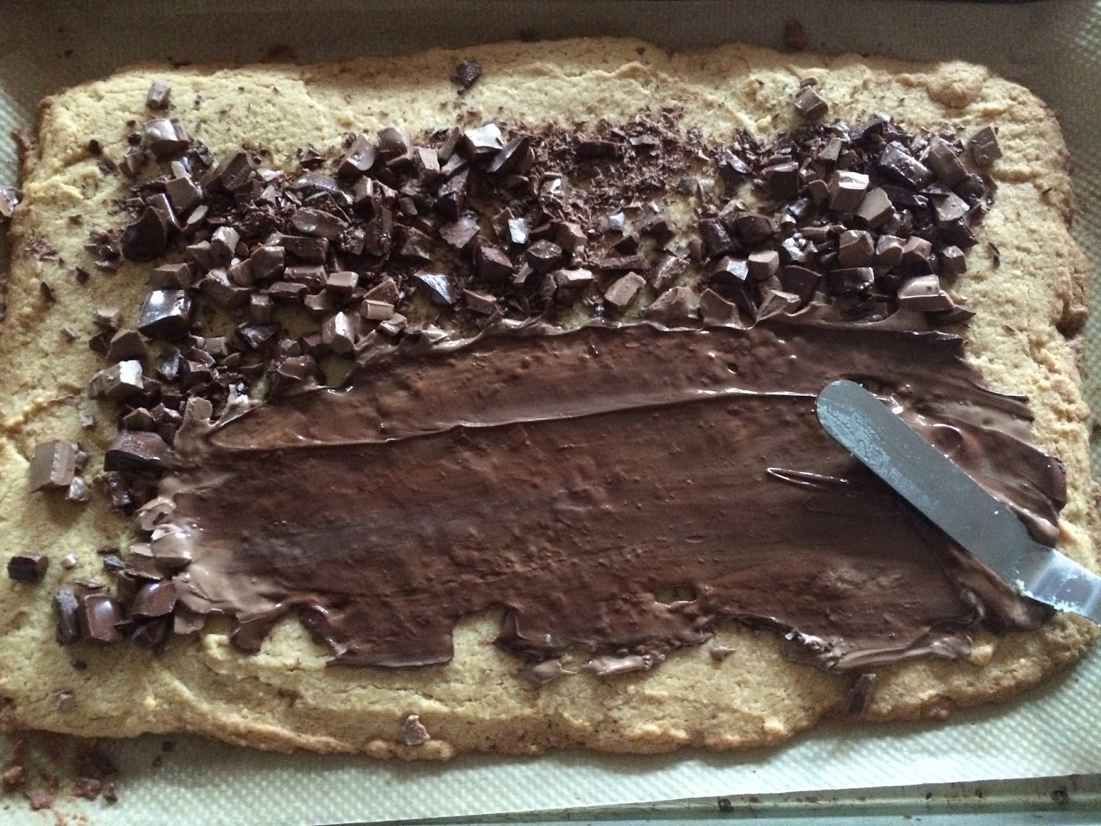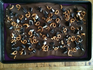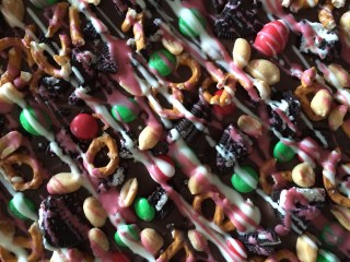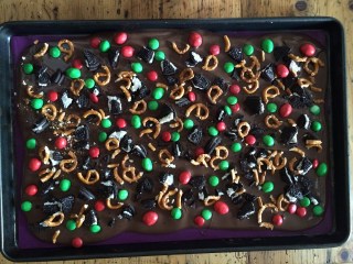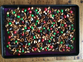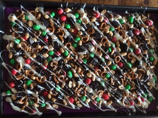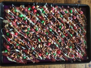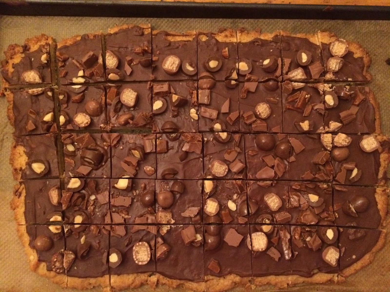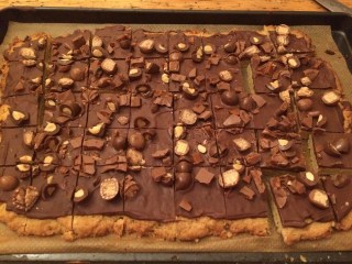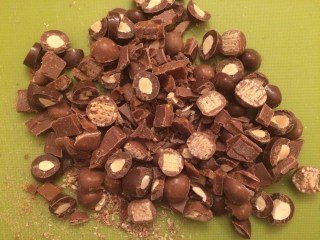Wer mag kann an dieser Stelle gehackte Süßigkeiten auf die noch warme Schokolade streuen. Ich habe eine Version mit gehackten schokolierten Mandeln, Daim-Riegeln und Lion-Kugeln gemacht. Dafür alles grob hacken und vermischen.