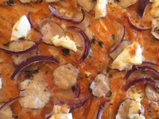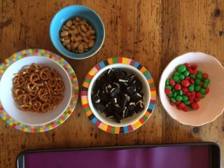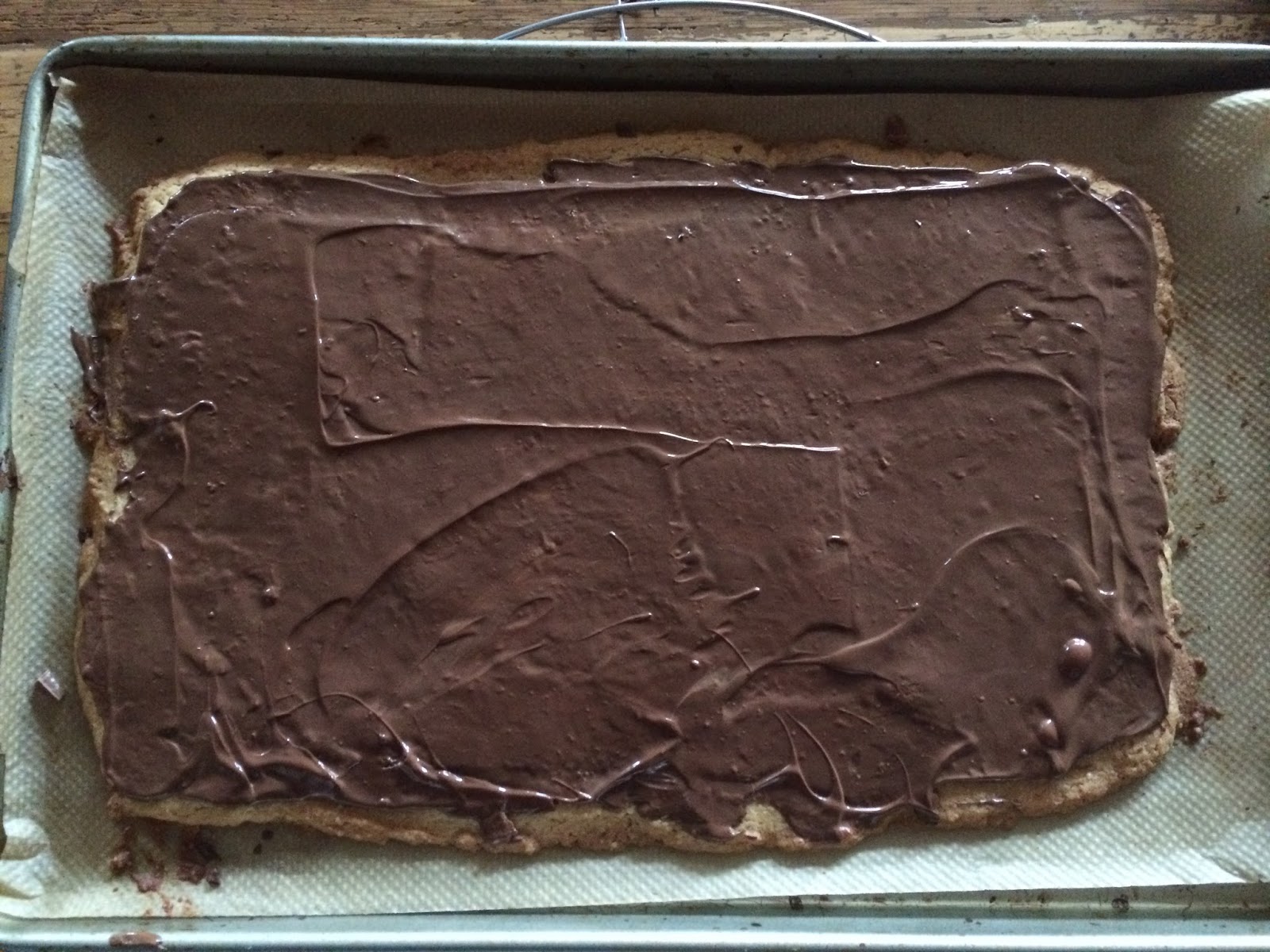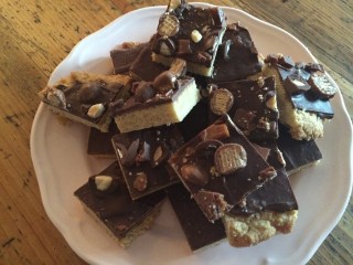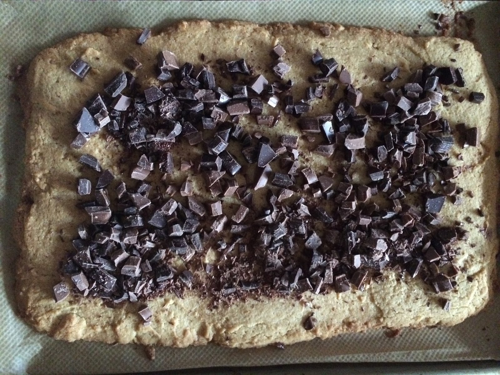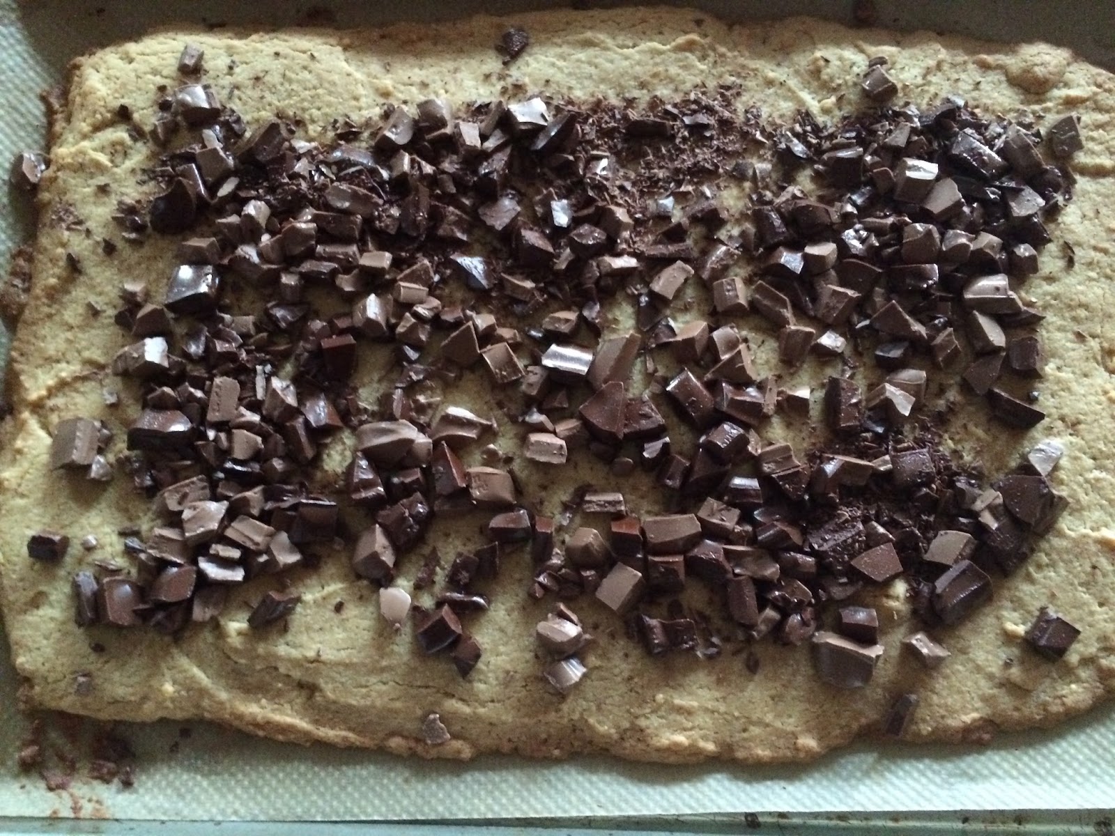Wer mag kann an dieser Stelle gehackte Süßigkeiten auf die noch warme Schokolade streuen. Ich habe eine Version mit gehackten schokolierten Mandeln, Daim-Riegeln und Lion-Kugeln gemacht. Dafür alles grob hacken und vermischen.