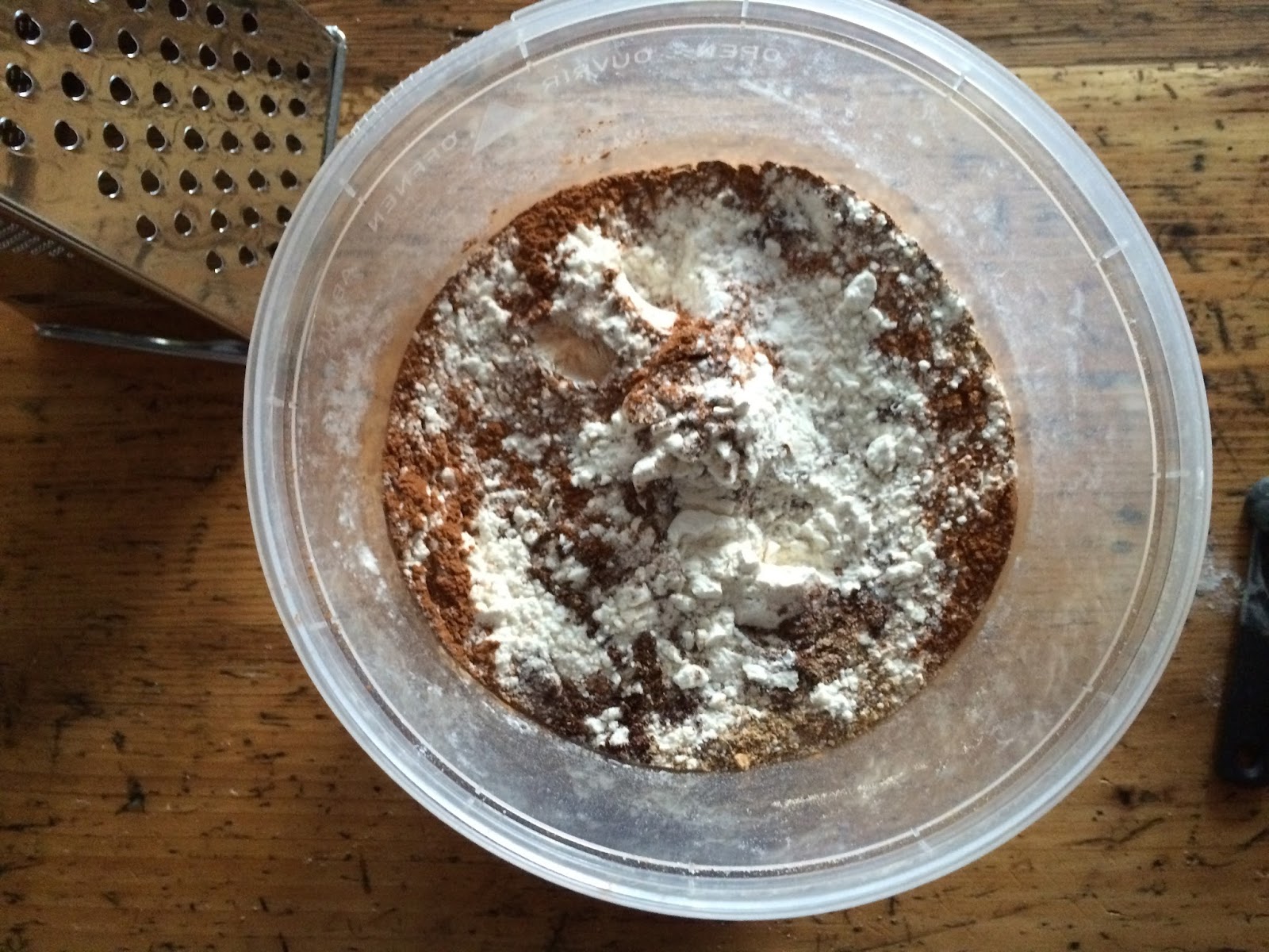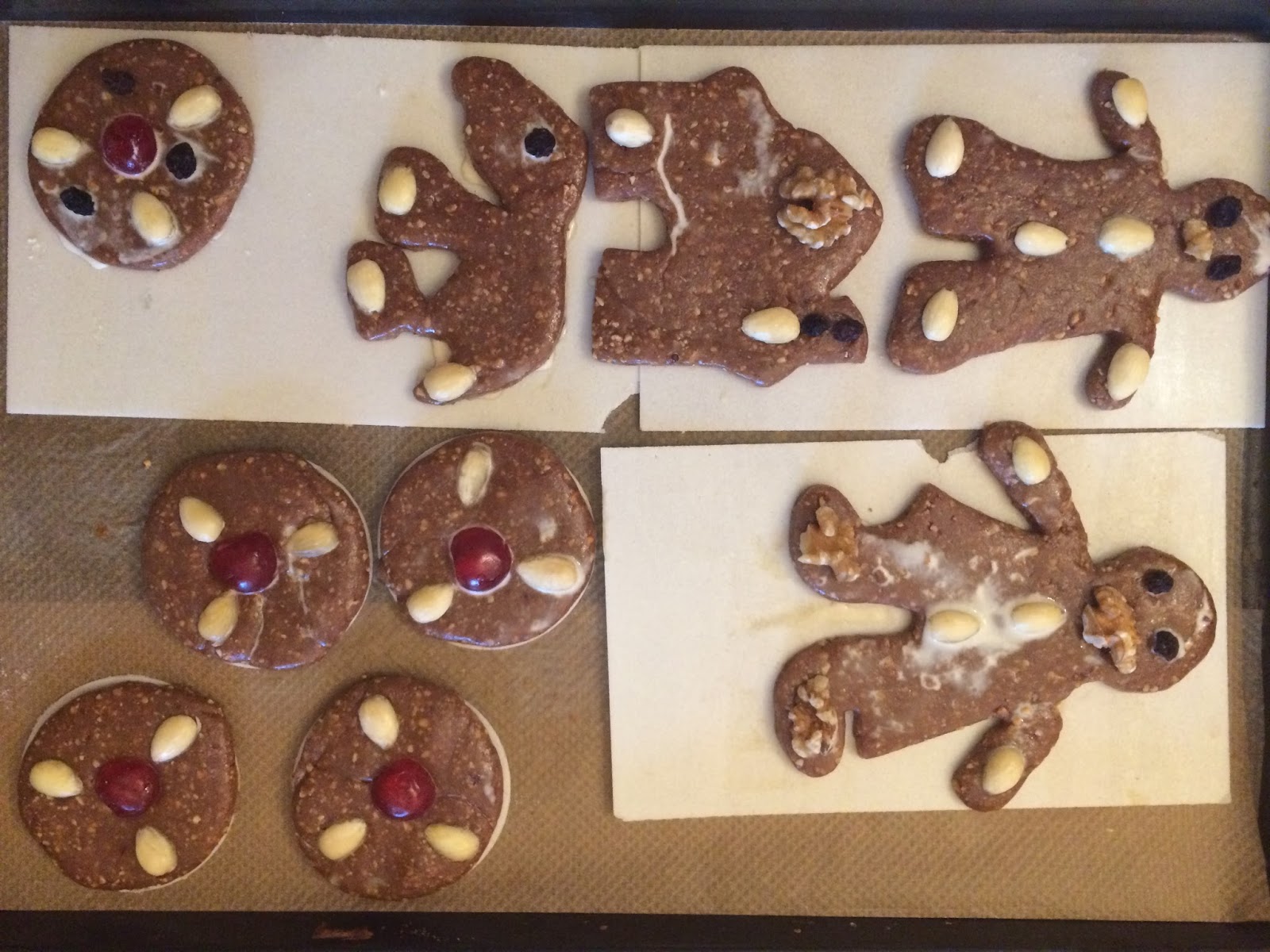 Man nehme Honig, braunen Zucker, Melasse oder dunklen Zuckerrübensirup und Butter. Außerdem brauchen wir Zimt und Nelken, Rosinen, Datteln und Korinthen. Und Möhren. Dann noch Kakao, Backpulver, gehackte Mandeln und Eier. Für die Deko etwas Zartbitterschokolade und Palmin. Mehr nicht.