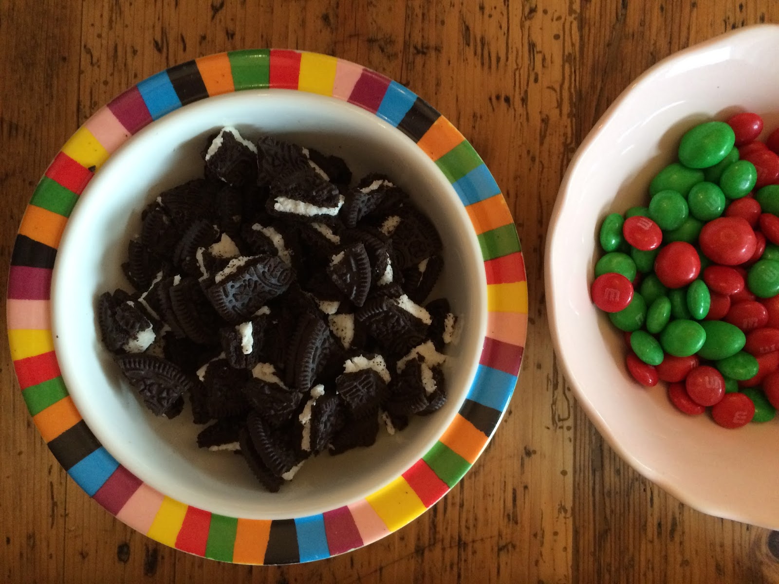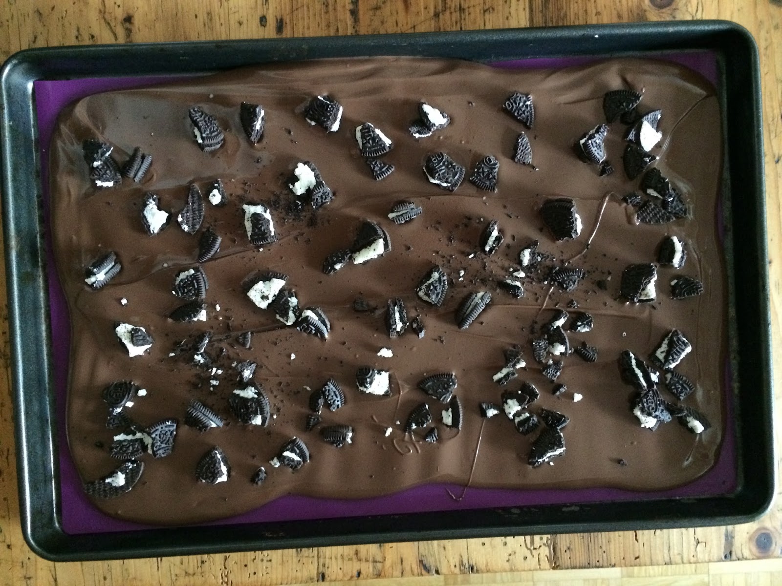 Dann die Zutaten der Größe nach darüber streuen. Ich beginne mit den Oreos,….