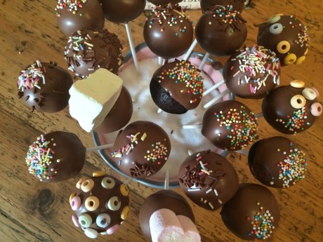 Cake Pops stehen schon sehr lange auf meiner To do-Liste, aber irgendwie kam immer etwas dazwischen. Nach der Zubereitung der Geburtstagstorte hatte ich so viele Kuchenreste und Buttercreme übrig, dass die Idee „Cake Pops“ sozusagen mit dem Zaunpfahl vor meiner Nase herum wedelte und sich nicht mehr verdrängen ließ. Ich meine, Kuchenkrümel und Buttercreme – was bitte kann daran nicht schmecken?! Schon während meines Studiums war ich ein großer Fan von den etwas altmodischeren, aber in der Herstellung im Prinzip entsprechenden Granatsplittern, die es in der Mensa der Uni gab. Von Zeit zu Zeit verzichtete ich also auf das Mittagessen und gönnte mir statt dessen solch cremiges, unförmiges, mit Schokolade überzogenes….Ding. Lecker. Der Granatsplitter von damals hat sich zum Cake Pop von heute weiterentwickelt und kommt nun ziemlich aufgebrezelt daher. Es gibt ihn in allen Farben und Formen, mit Augen, Krone oder Geweih – je nach Anlass und Jahreszeit – und immer am Stiel. Endlich bin ich also auch auf den Cake Pop-Zug aufgesprungen, halte es zunächst aber noch etwas klassisch mit einfachem Schokoladenüberzug. Man muss ja noch Ziele haben….