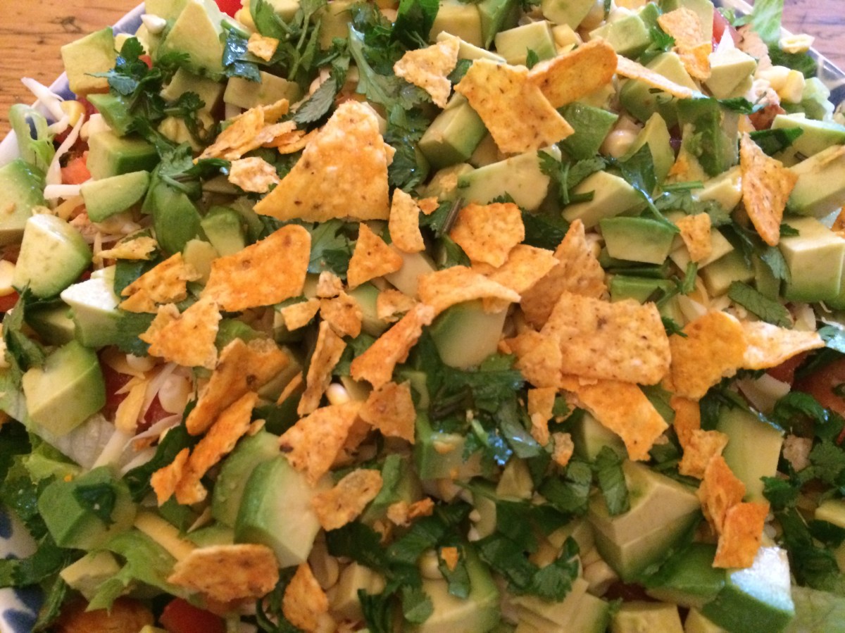 Veröffentlicht 21. August 2016 in 3264 × 2448 in Taco-Salat mit homemade Ranch-Dressing, Hähnchen und Nacho-Chips