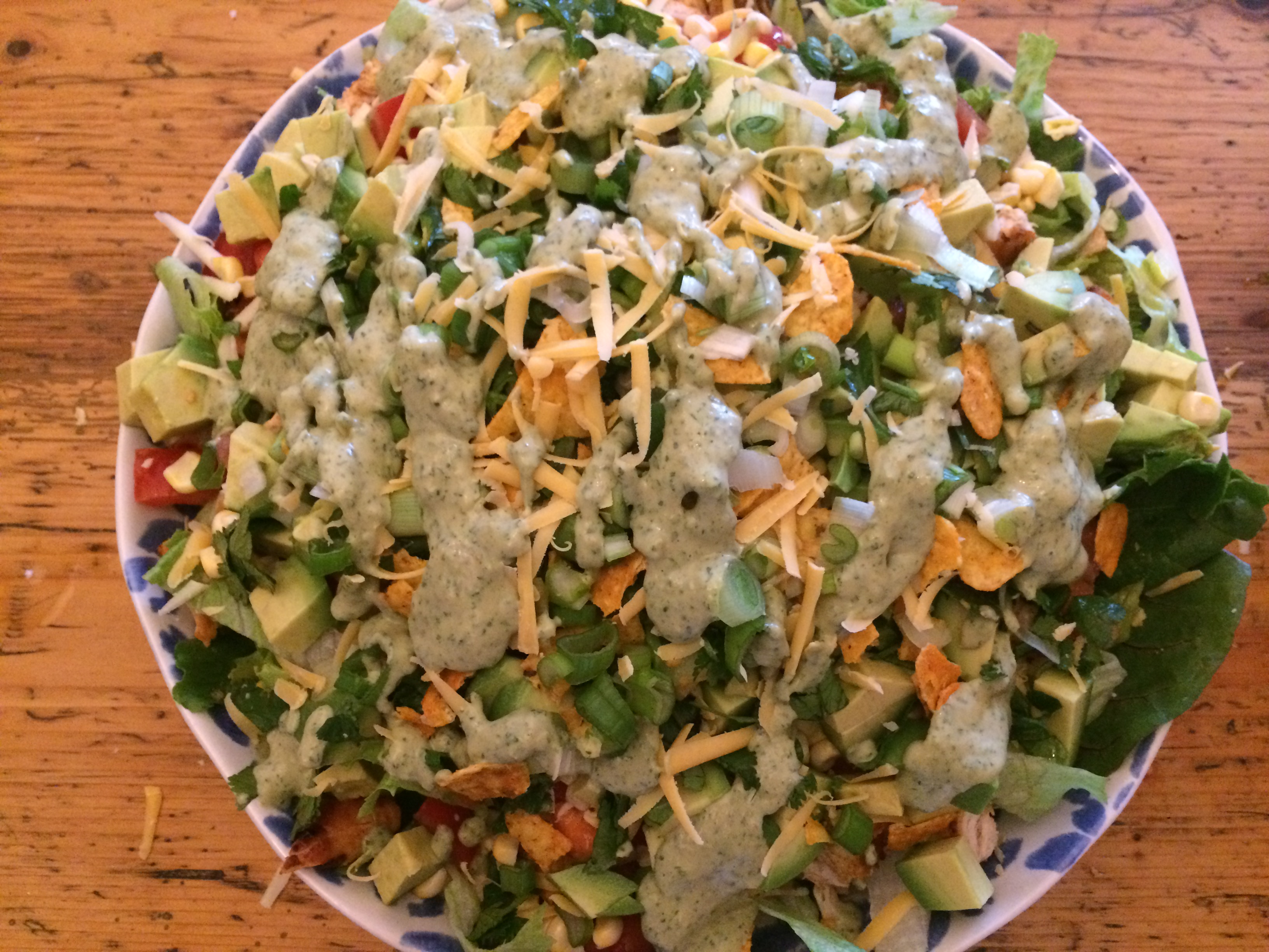 Veröffentlicht 21. August 2016 in 3264 × 2448 in Taco-Salat mit homemade Ranch-Dressing, Hähnchen und Nacho-Chips