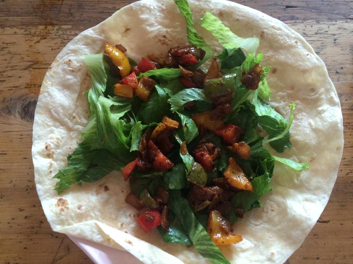 Veröffentlicht 27. August 2016 in 3264 × 2448 in Wraps mit Hähnchen, Paprika-Zwiebel-Gemüse, Avocado, Käse und Sriracha-Sauce