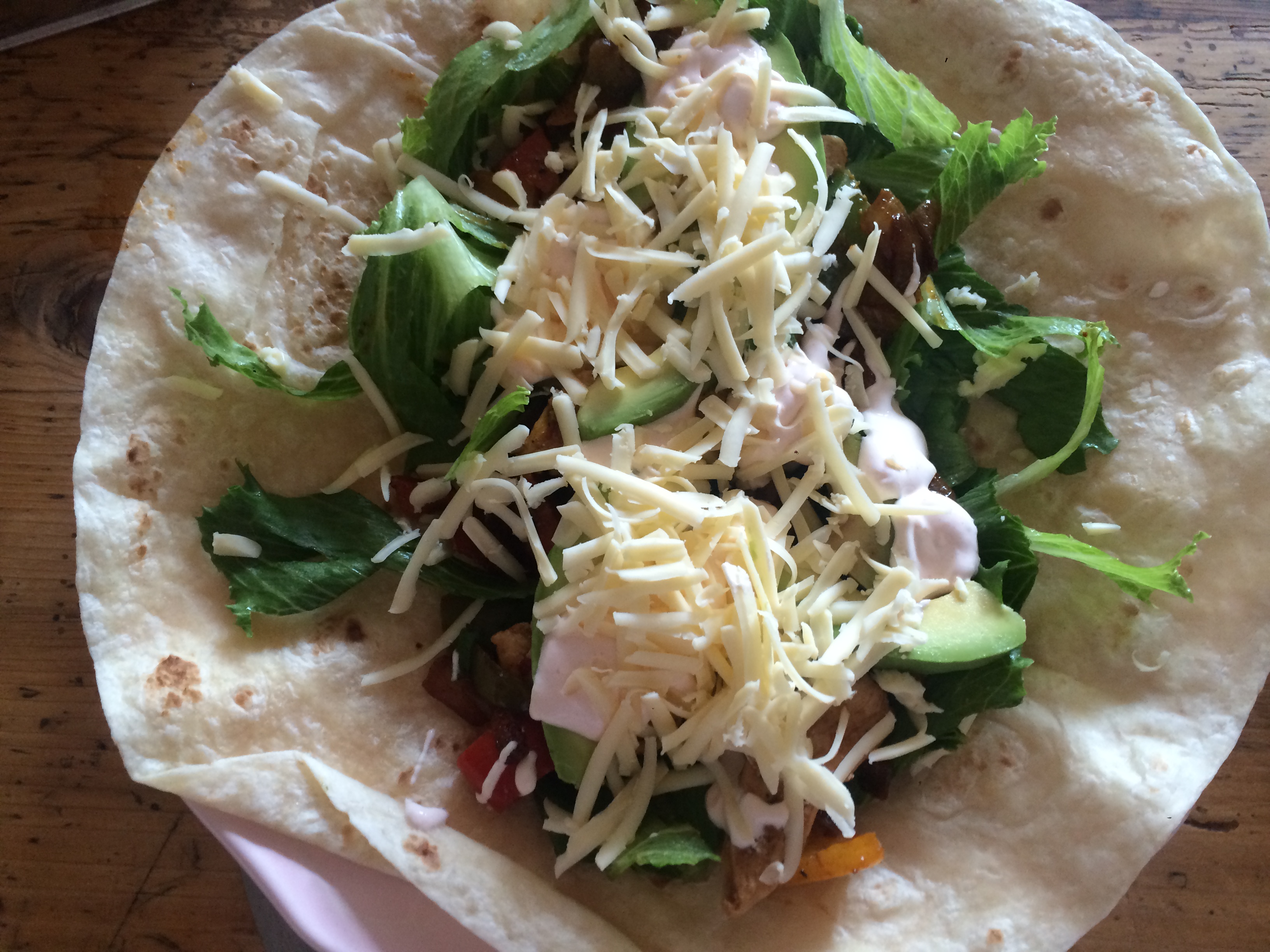 Veröffentlicht 27. August 2016 in 3264 × 2448 in Wraps mit Hähnchen, Paprika-Zwiebel-Gemüse, Avocado, Käse und Sriracha-Sauce