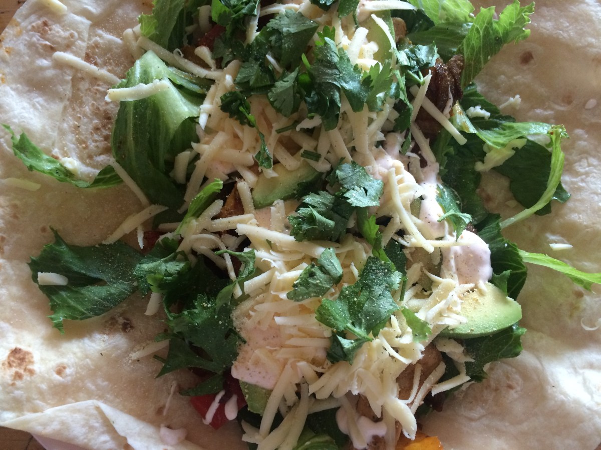 Veröffentlicht 27. August 2016 in 3264 × 2448 in Wraps mit Hähnchen, Paprika-Zwiebel-Gemüse, Avocado, Käse und Sriracha-Sauce