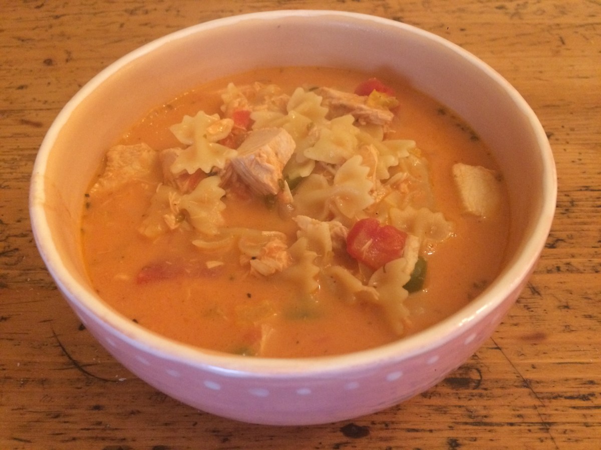 Veröffentlicht 28. Oktober 2016 in 3264 × 2448 in Cremige Nudelsuppe mit Putenfleisch und Tomaten