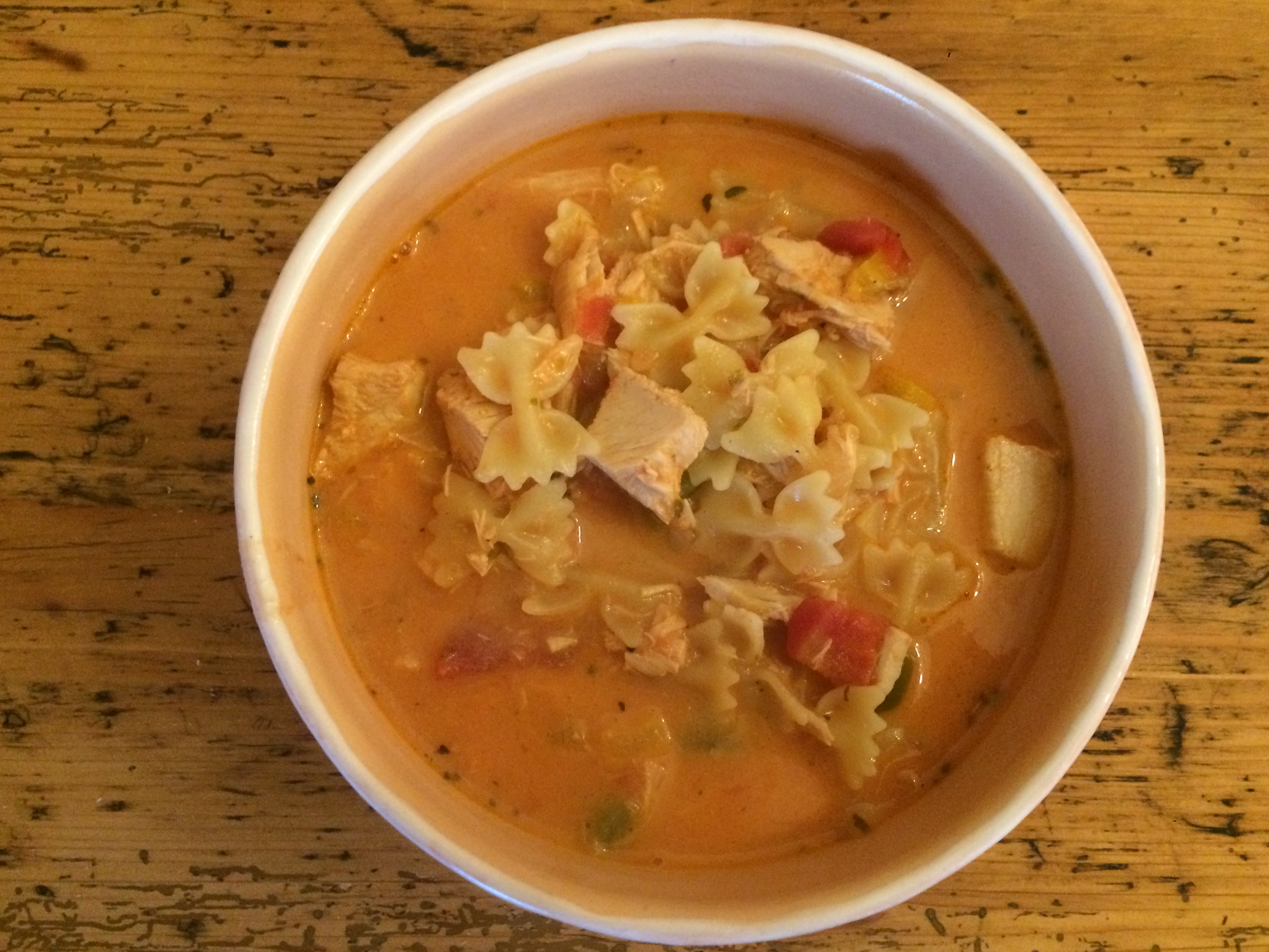 Veröffentlicht 28. Oktober 2016 in 3264 × 2448 in Cremige Nudelsuppe mit Putenfleisch und Tomaten