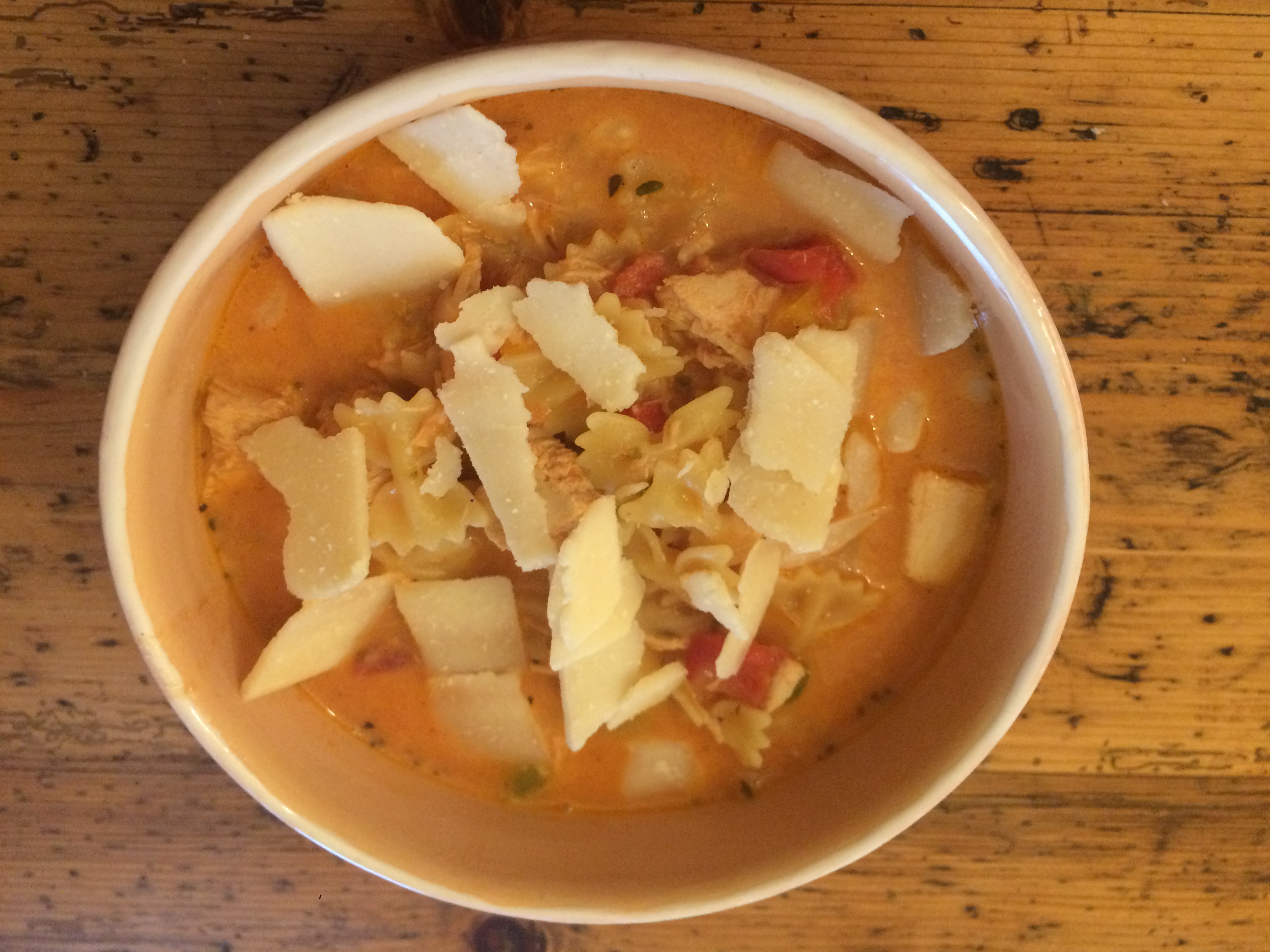 Veröffentlicht 28. Oktober 2016 in 3264 × 2448 in Cremige Nudelsuppe mit Putenfleisch und Tomaten