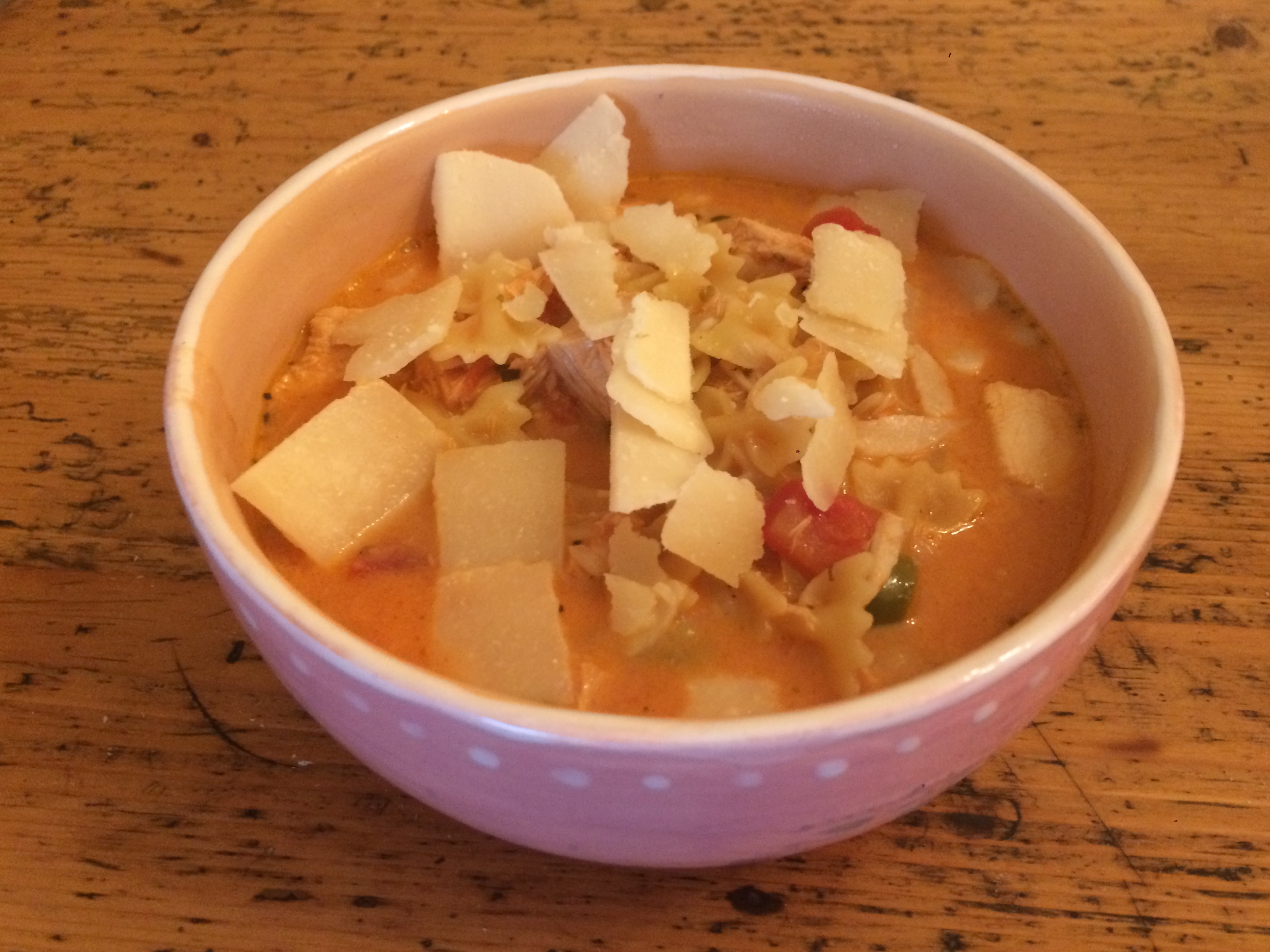 Veröffentlicht 28. Oktober 2016 in 3264 × 2448 in Cremige Nudelsuppe mit Putenfleisch und Tomaten