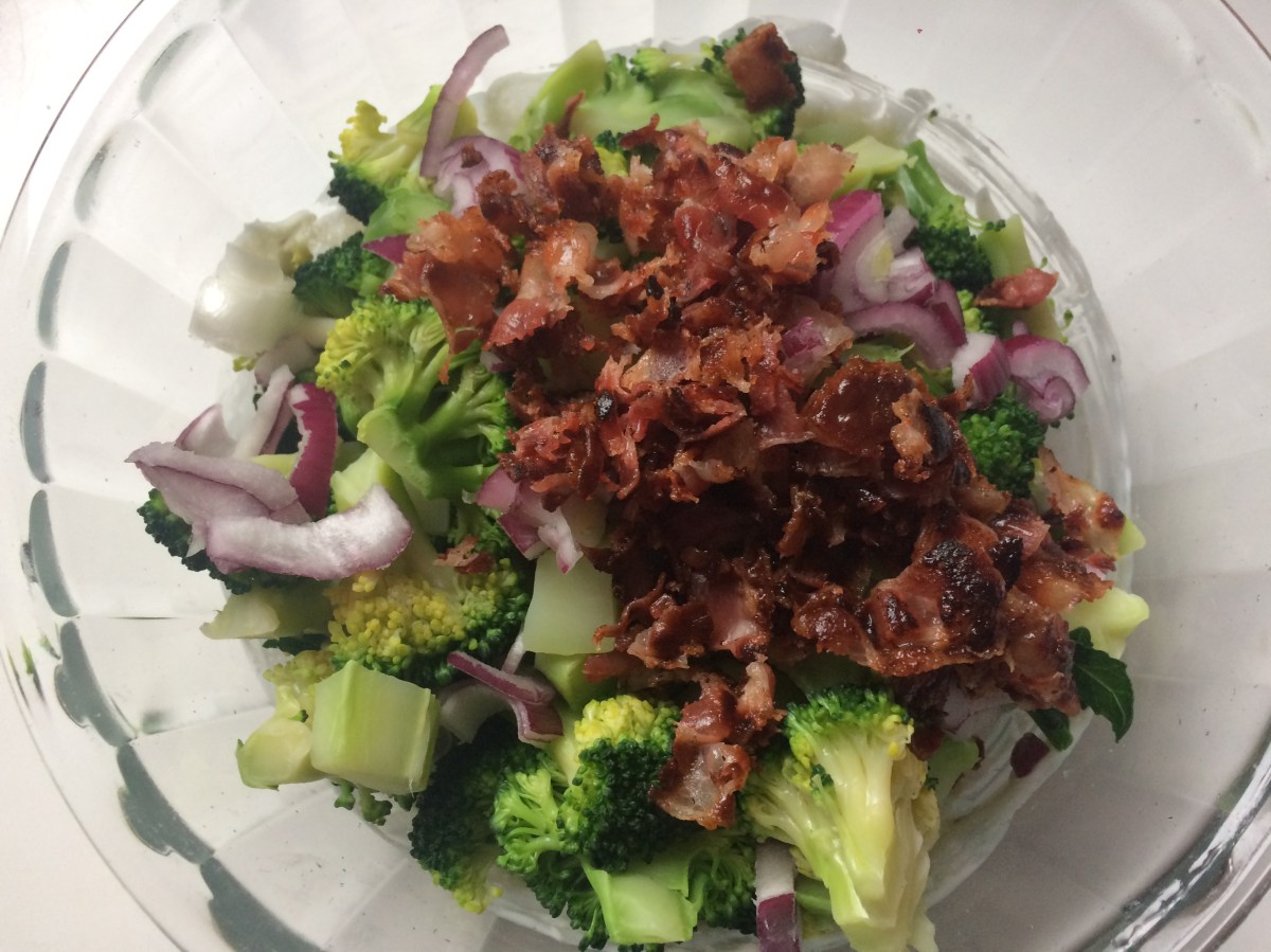 Veröffentlicht 12. Februar 2017 in 3264 × 2448 in Brokkoli-Salat mit knusprigem Bacon, Käse und roten Zwiebeln