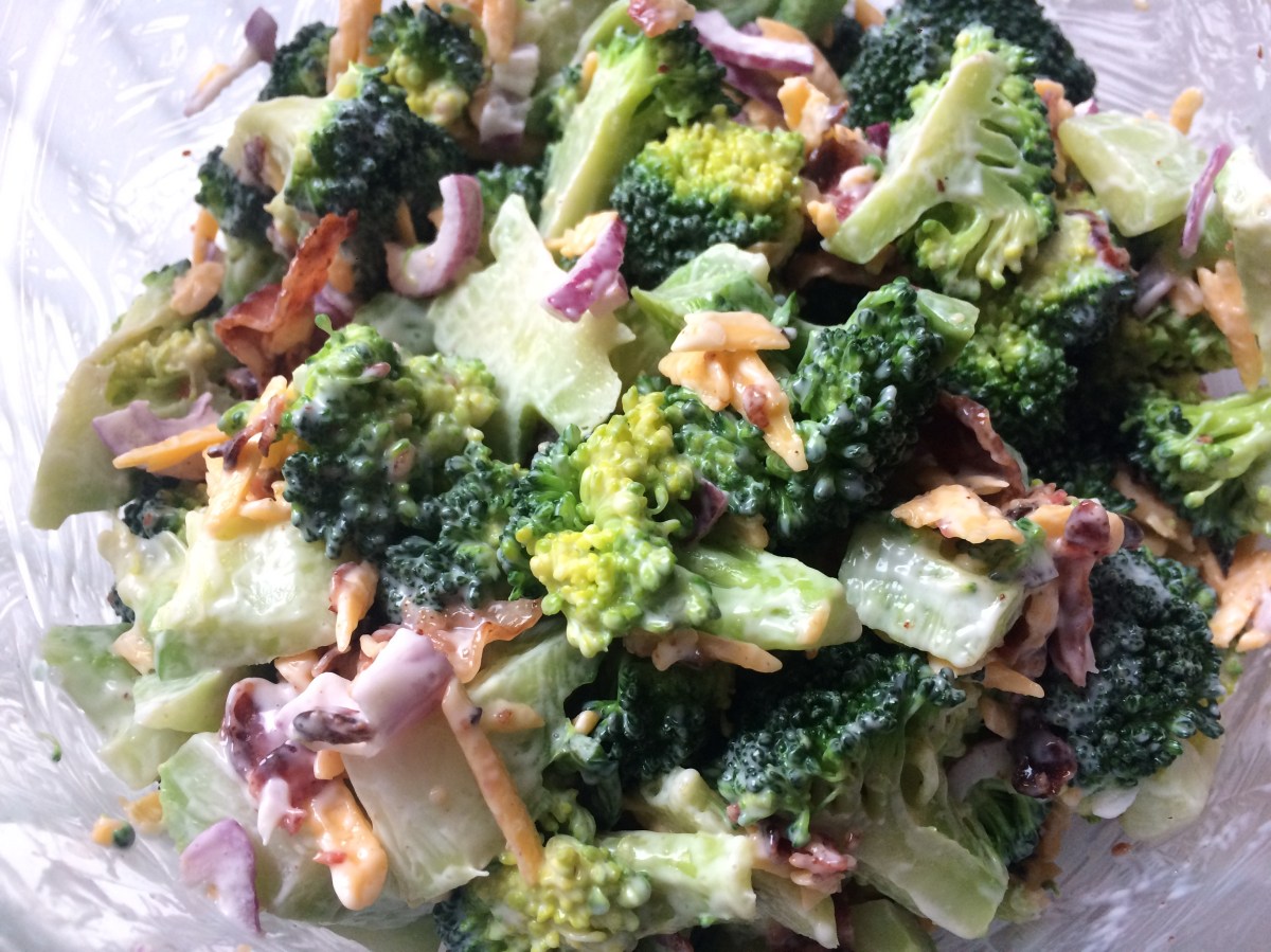 Veröffentlicht 12. Februar 2017 in 3264 × 2448 in Brokkoli-Salat mit knusprigem Bacon, Käse und roten Zwiebeln