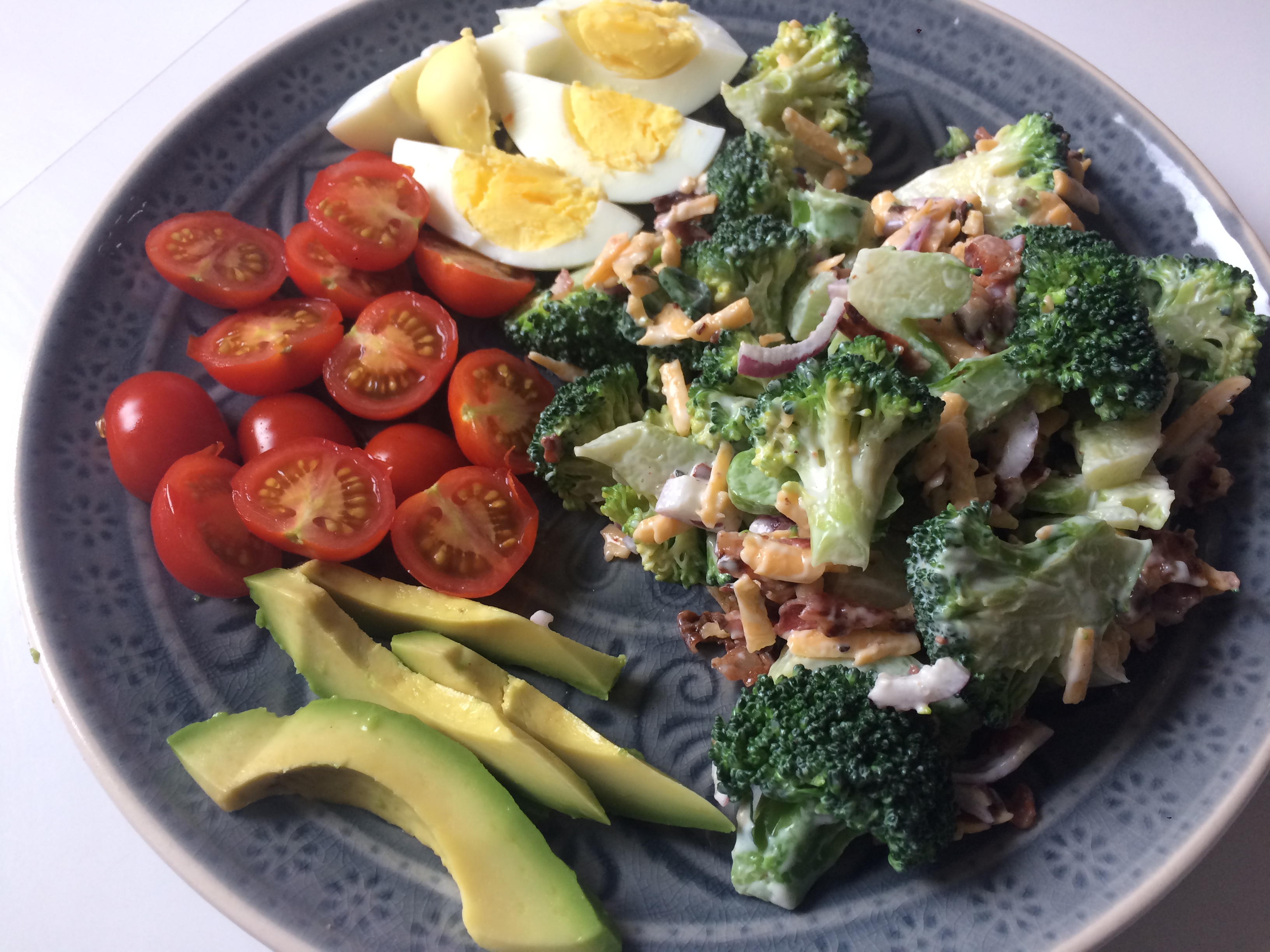 Veröffentlicht 12. Februar 2017 in 3264 × 2448 in Brokkoli-Salat mit knusprigem Bacon, Käse und roten Zwiebeln