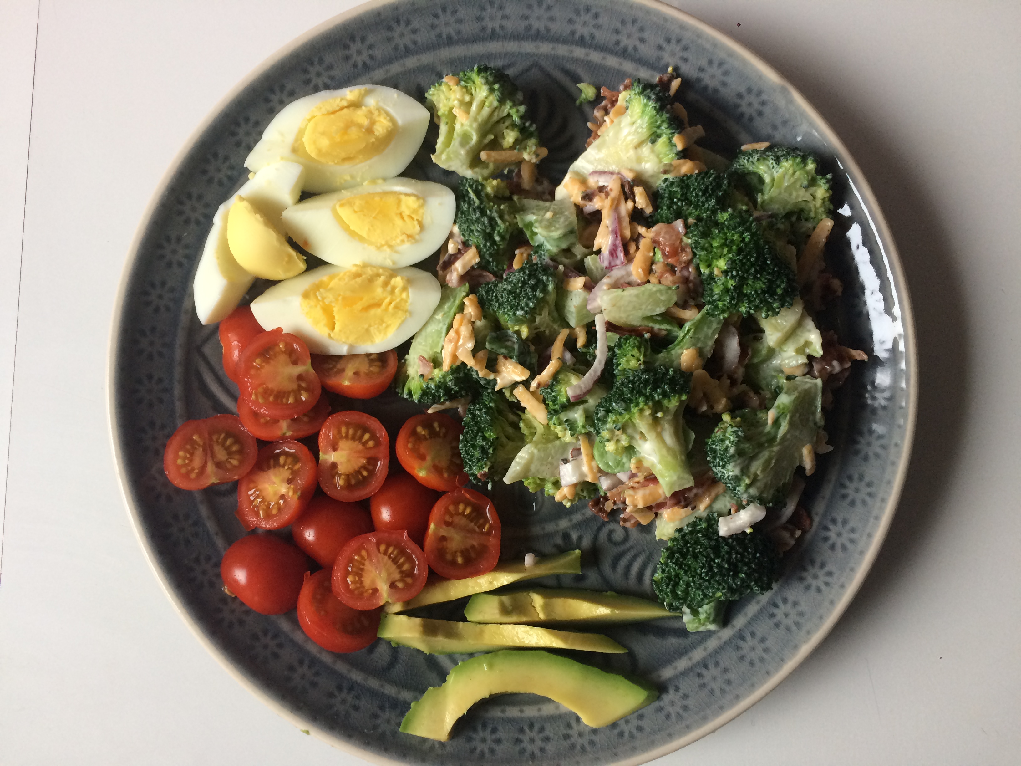 Veröffentlicht 12. Februar 2017 in 3264 × 2448 in Brokkoli-Salat mit knusprigem Bacon, Käse und roten Zwiebeln