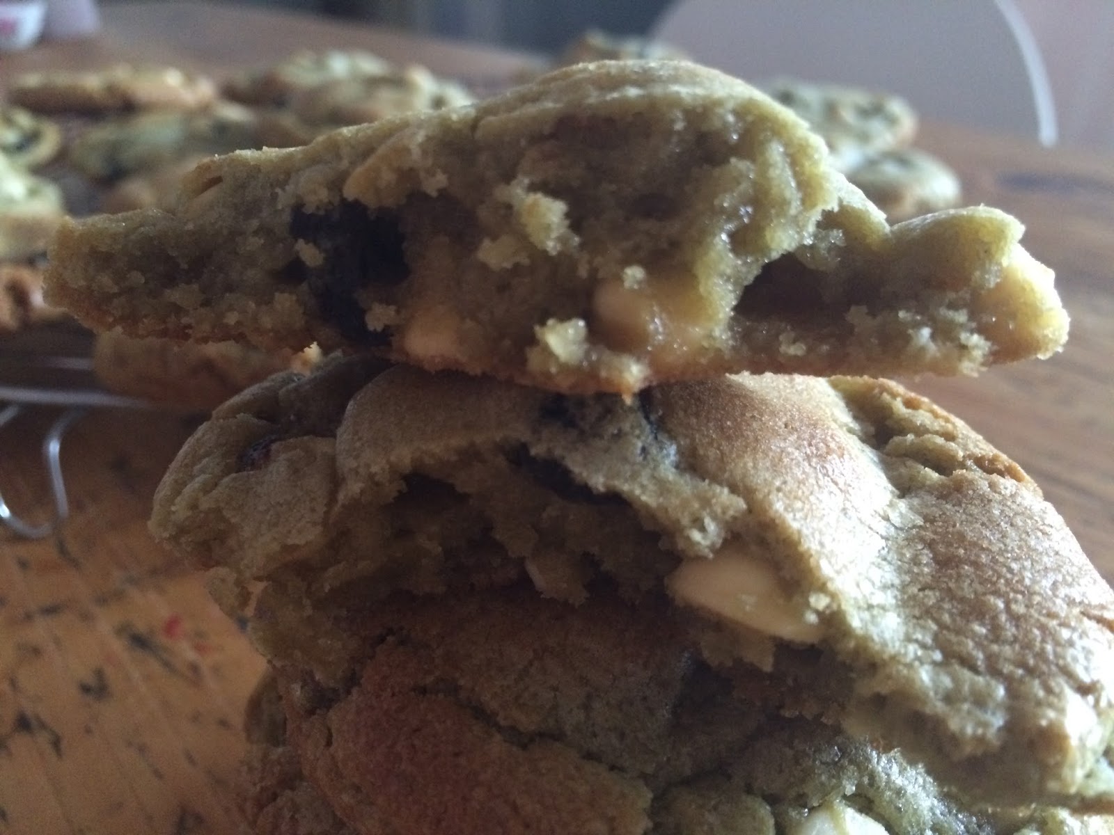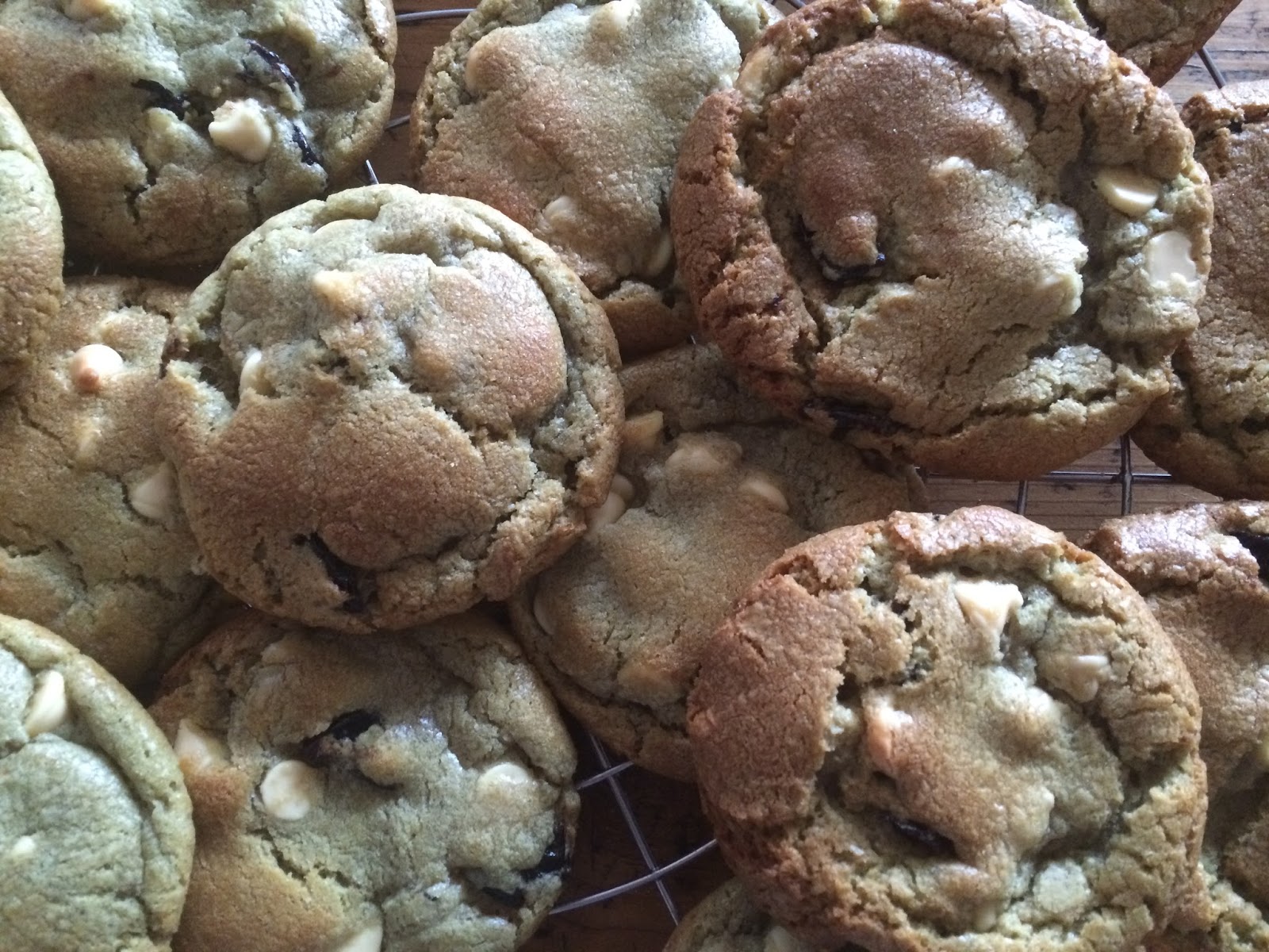 Cookies mit Pistaziencreme, weißer Schokolade und Kirschen