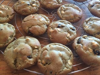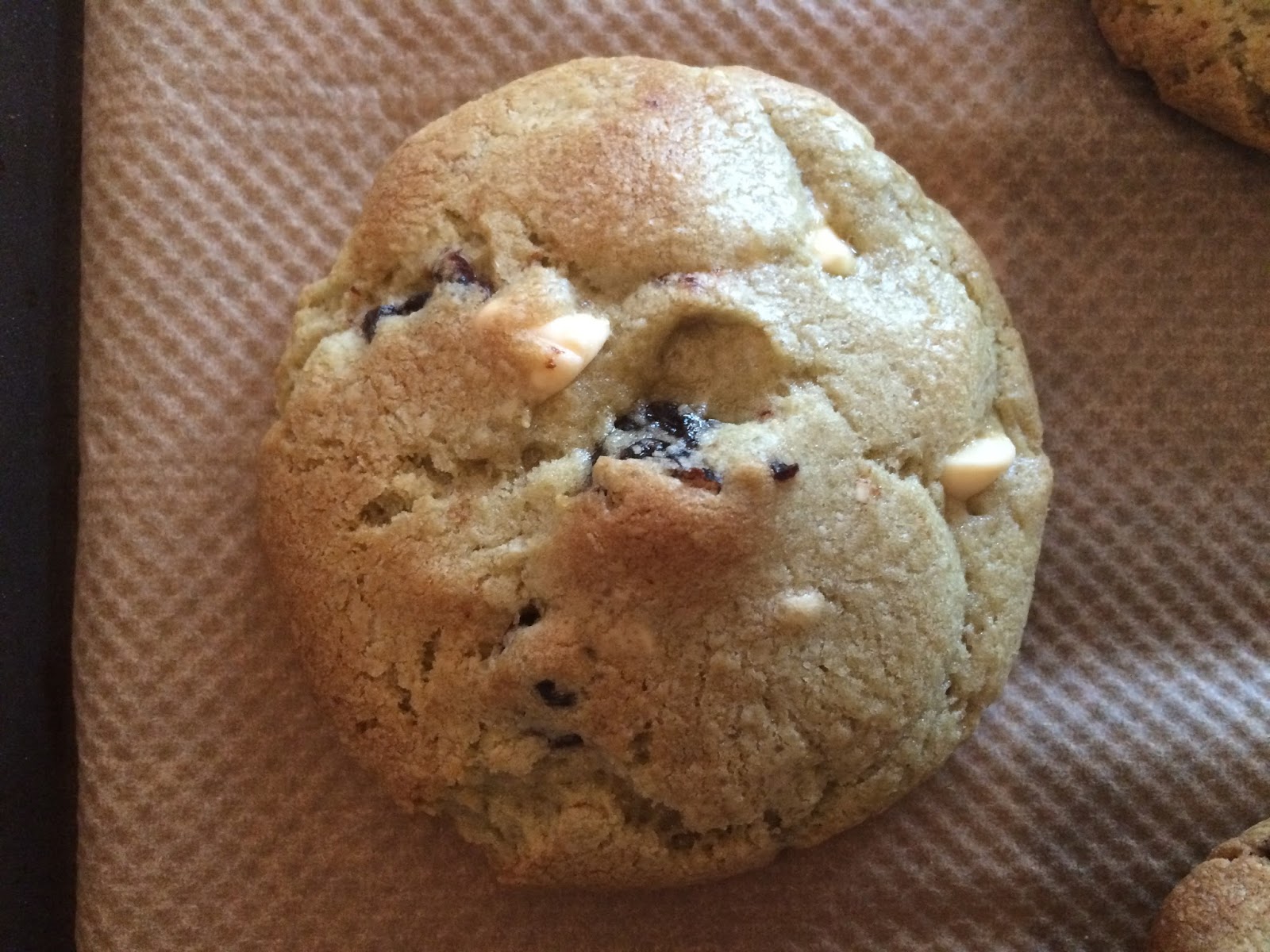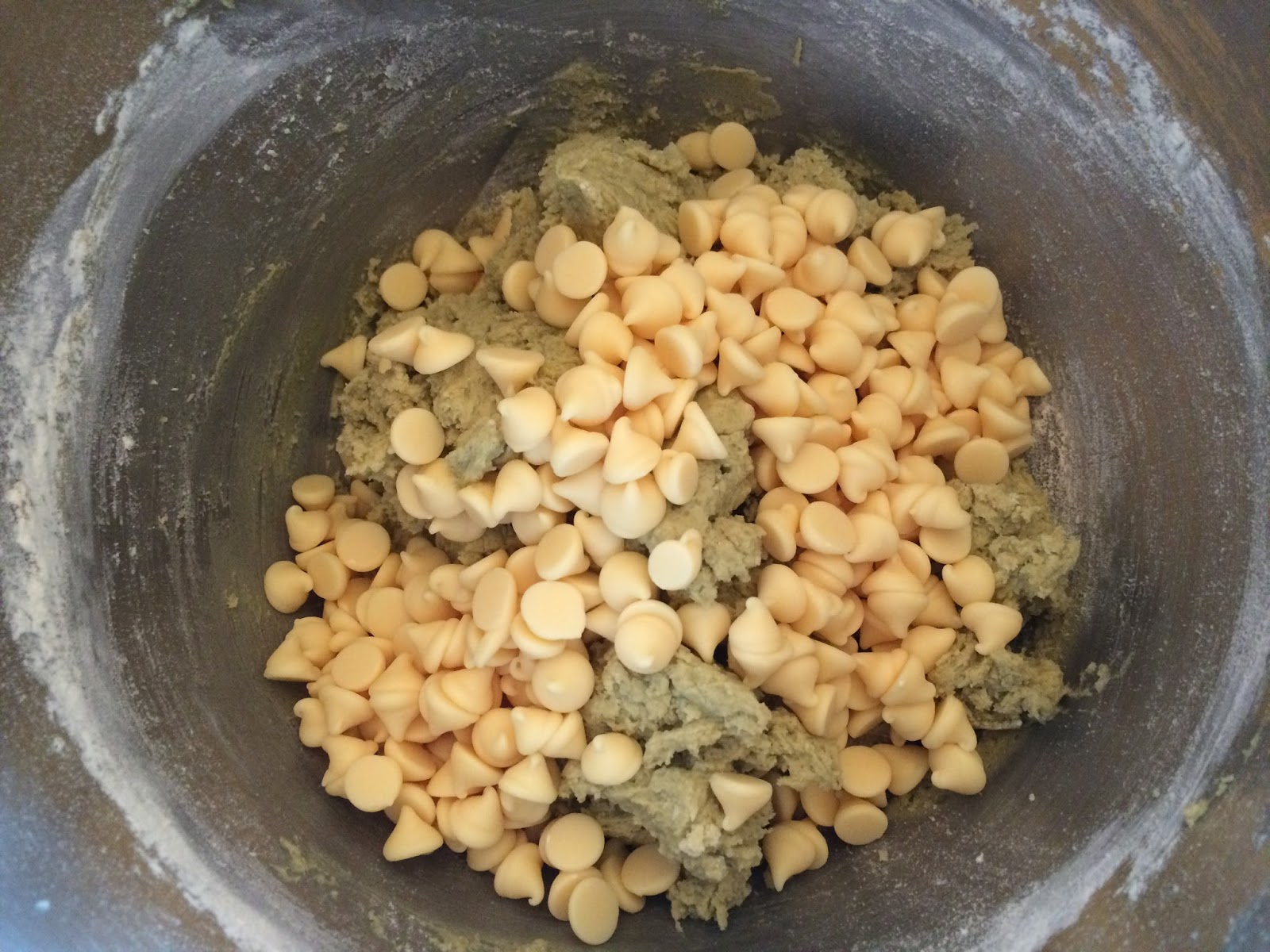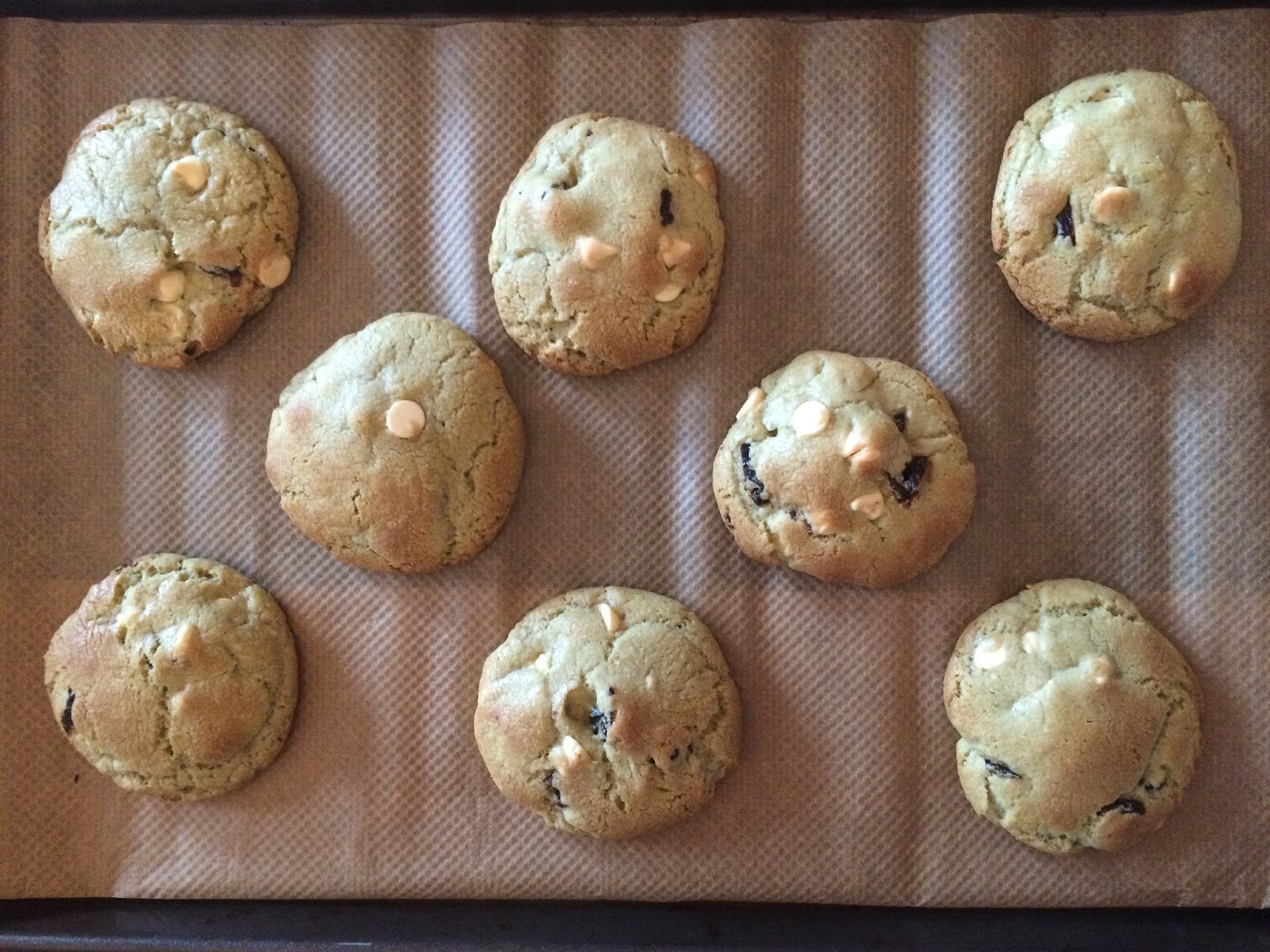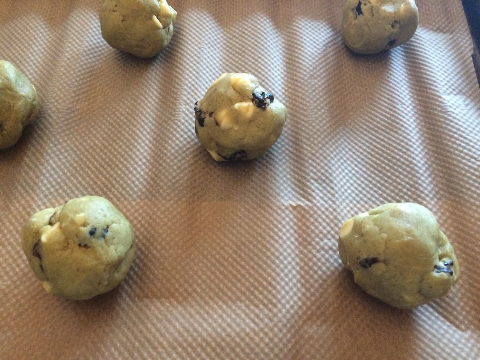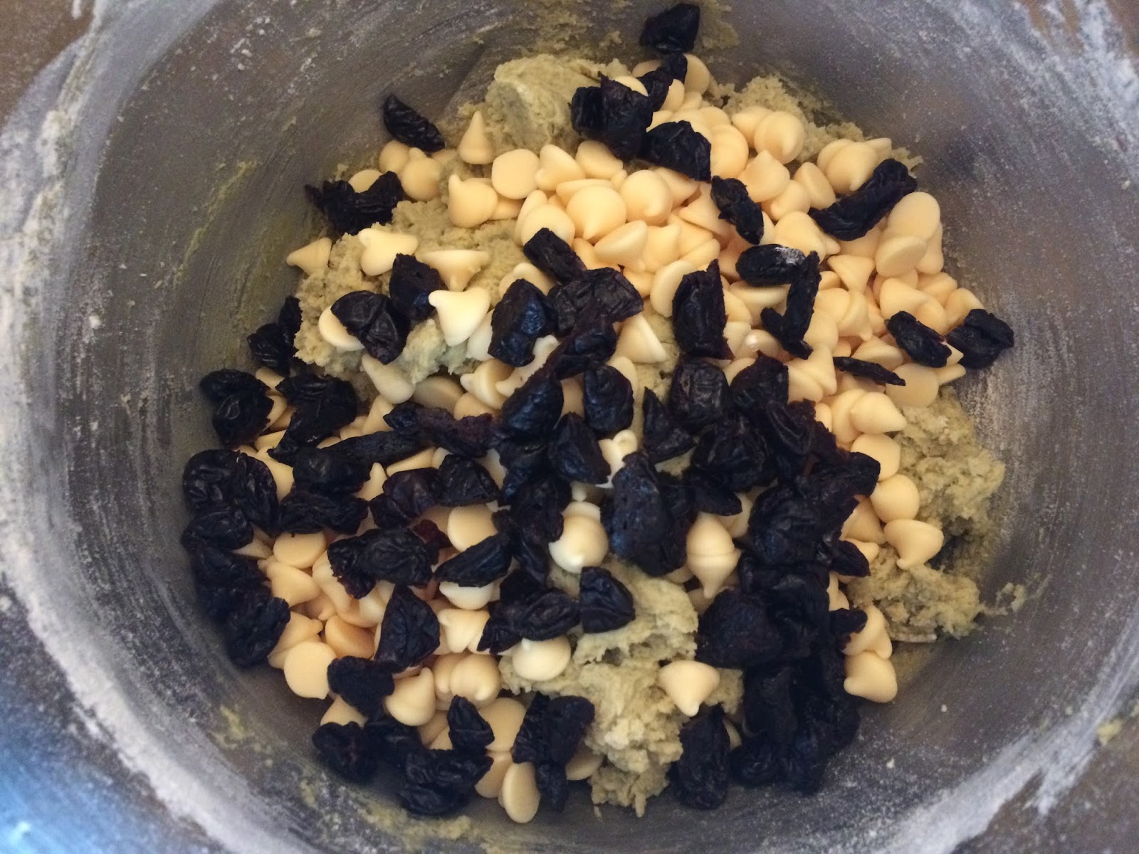 Ansonsten benötigen wir wie üblich Butter, Zucker (weiß und braun), Sirup, Eier, Vanilleessenz (oder Vanillezucker), Mehl, Backnatron (Baking Soda), Stärke und Salz. Dazu kommen noch gehackte weiße Schokolade oder weiße Chocolate Chips und getrocknete Kirschen. Yummy!