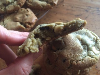 Also, ich weiß ja nicht, wie es euch geht, aber ich bin völlig hingerissen von süßer Pistaziencreme. Wirklich völlig – ich bin ihr geradezu verfallen und habe sie mir bereits zwischen Cookies gestrichen, aufs Brot geschmiert und auch pur gegessen. So gut. Da lag der Gedanke natürlich nahe, diese wunderbare, grüne Creme nicht nur auf die Cookies zu streichen, sondern sie gleich im Teig zu verarbeiten. Und – was soll ich euch sagen? Auch verarbeitet verliert die Creme nichts von ihrem Charme. Dazu noch jede Menge weiße Schokolade und getrocknete Kirschen und die ganze Sache wird ziemlich unwiderstehlich. Aber, seht selbst und, vor allem, probiert´s aus!