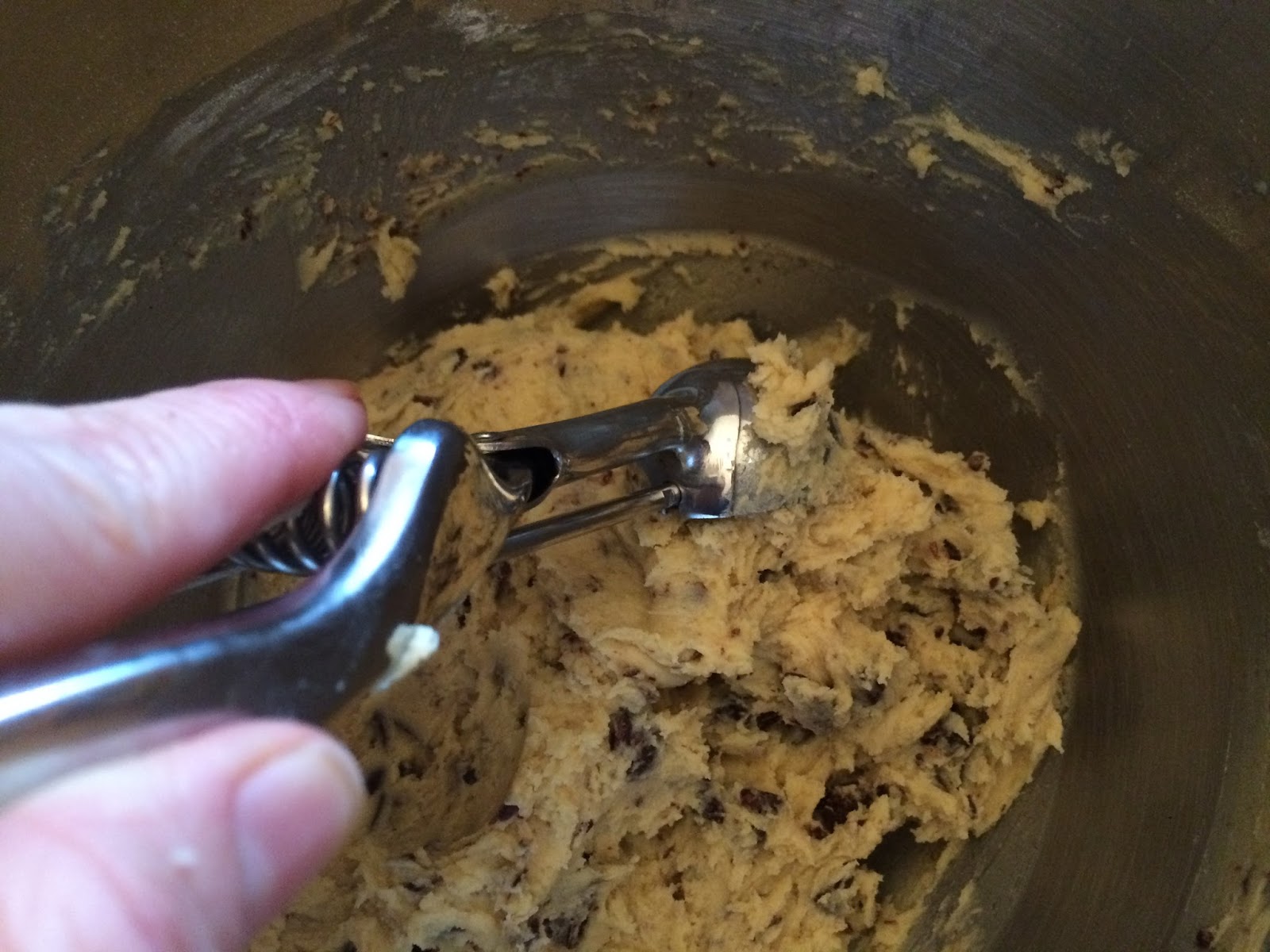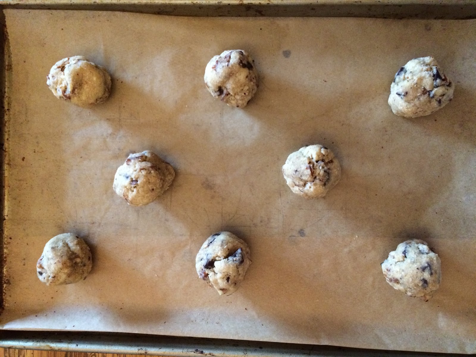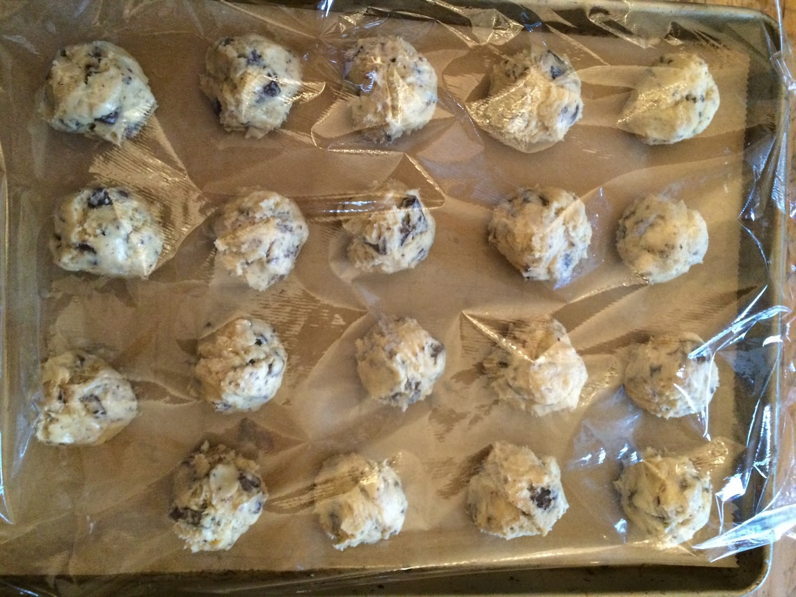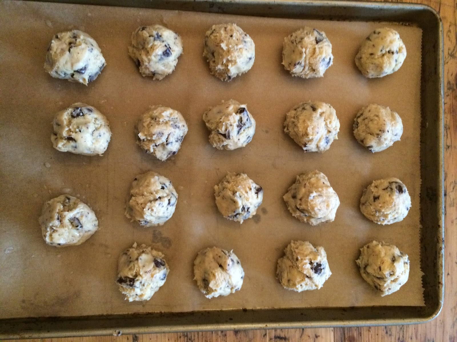 …. und mehrere Stunden, am besten über Nacht, in den Kühlschrank stellen. Das Kühlen kann nicht ausgelassen werden, sonst fließen euch die Cookies weg… (Wenn euer Blech zu groß für den Kühlschrank ist, dann nehmt ihr Teller o. ä.)