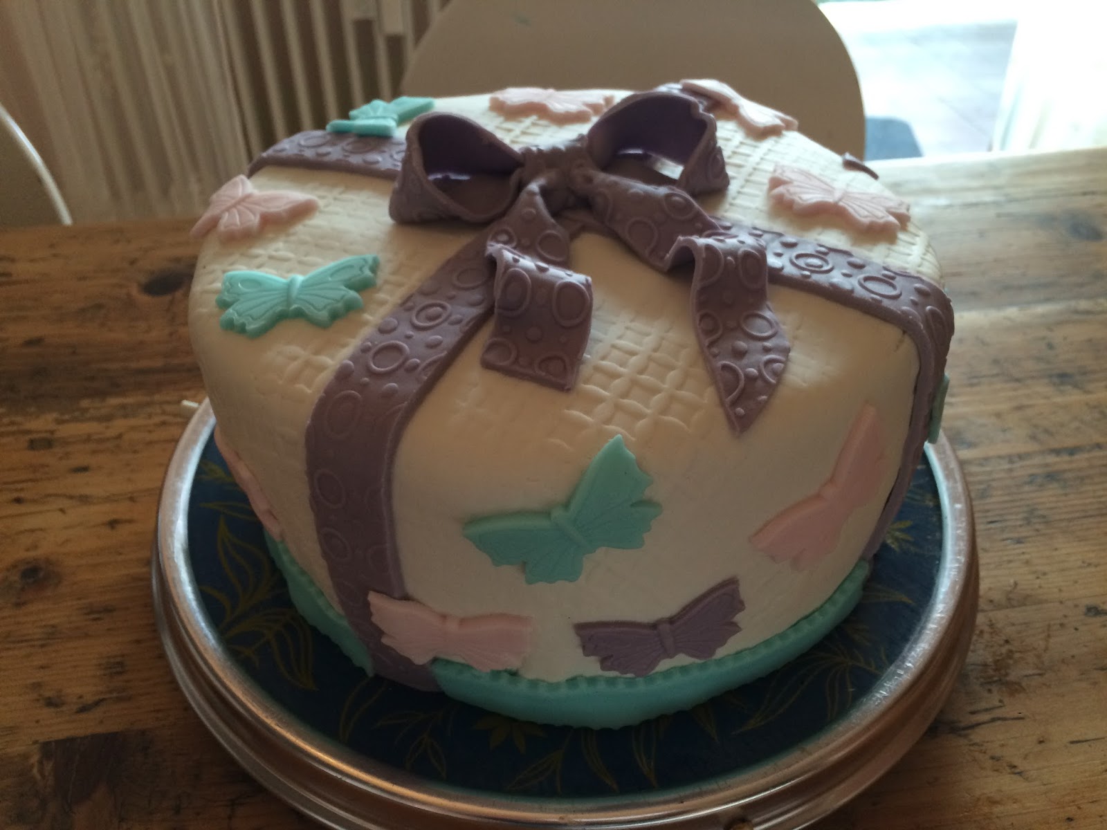 Die Zutaten- und Werkzeugliste ist hier relativ umfangreich und, wenn ihr nicht sowieso hin und wieder Motivtorten mit Rollfondant anfertigt, werdet ihr euch sicherlich einiges bestellen müssen. Ausstecher, Rollfondant und Lebensmittelkleber kann man prima online bei Pati-Versand bestellen. Die liefern auch ganz fix.Ich habe mir mein Werkzeug so nach und nach zusammen gesammelt und kann die Quellen nicht mehr so genau eruieren, aber Strukturwalzen bekommt ihr auch online. Ich habe eine spezielle Ausrollmatte für Rollfondant, eine handelsübliche Silikonmatte tut es aber auch. Ein wenig Palmin Soft kann nicht schaden, ansonsten brauchen wir noch ein normales Messer und einen Pinsel. Ich habe einen sog. Ribbon-Ausroller verwendet, der austauschbare Rädchen mit Zacken, Wellen etc. hat und ein Band mit durchweg gleicher Breite ausrollt. Auch das ist aber nicht unbedingt nötig, ein Messer oder Teigrädchen ist auch ok. Weiter benötigt ihr natürlich eine Tortenplatte. Backtrennpapier und eine kleine Winkelpalette sind auch von Vorteil. Als Backform habe ich drei runde Backformen mit einem Durchmesser von etwa 22 cm verwendet. Ihr könnt natürlich auch eine normale 26 cm-Springform nehmen, aber dann solltet ihr die Teigmenge nochmal um die Hälfte erhöhen und den Teig wenigstens in zwei Durchgängen backen.