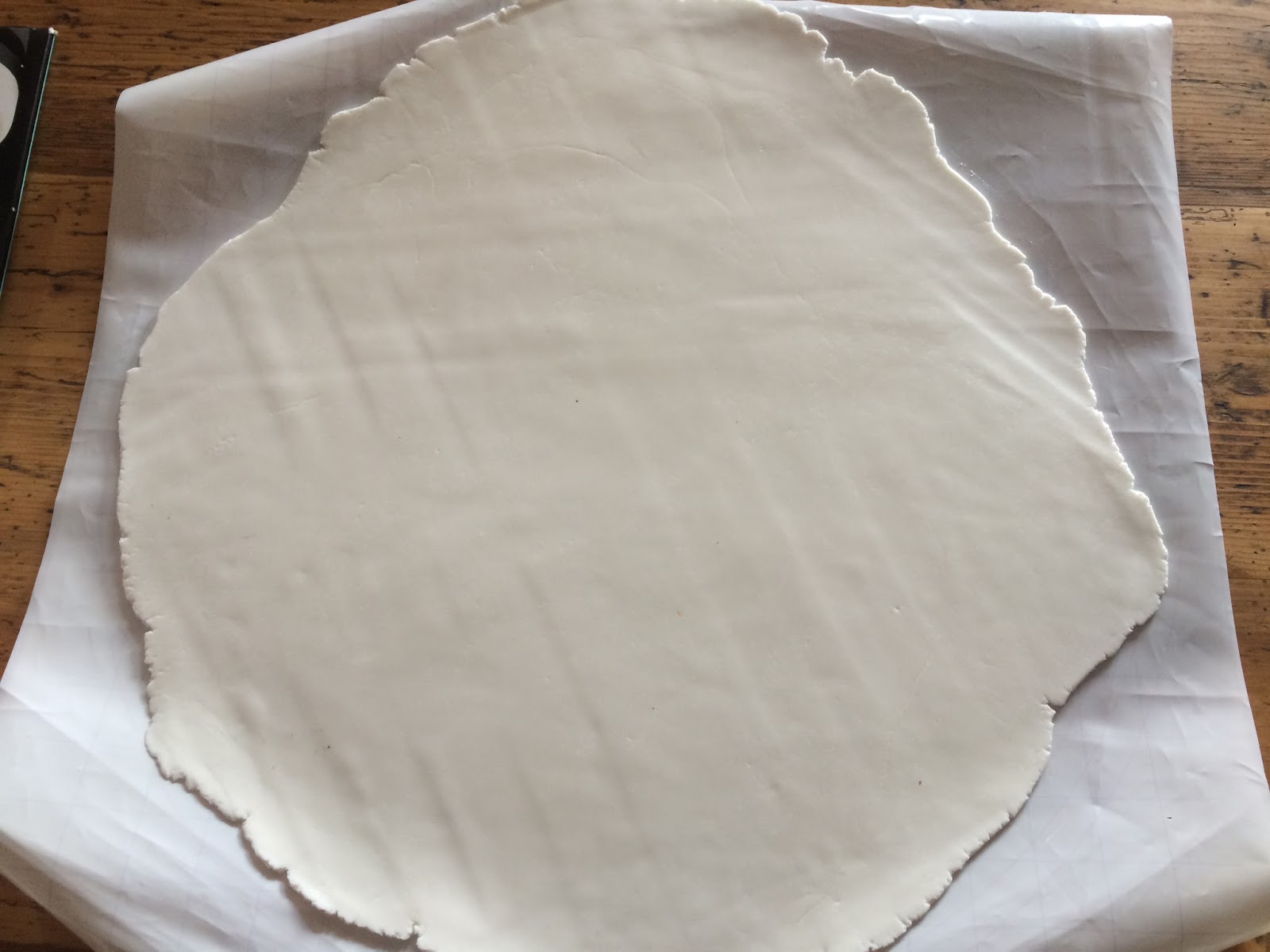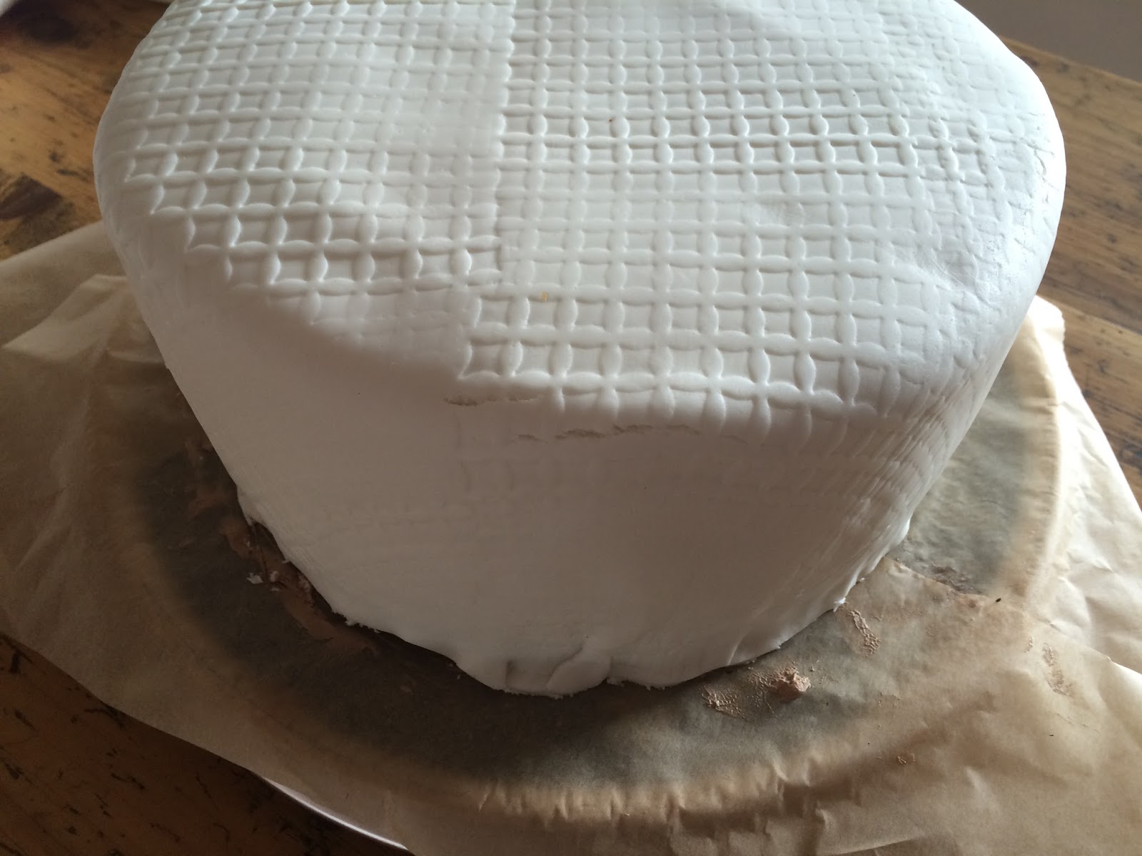 Wenn der Fondant schön geschmeidig ist, auf der Silikonmatte zu einer großen kreisrunden Fläche ausrollen, die die Torte bedecken kann. Auch das dauert eine Weile.