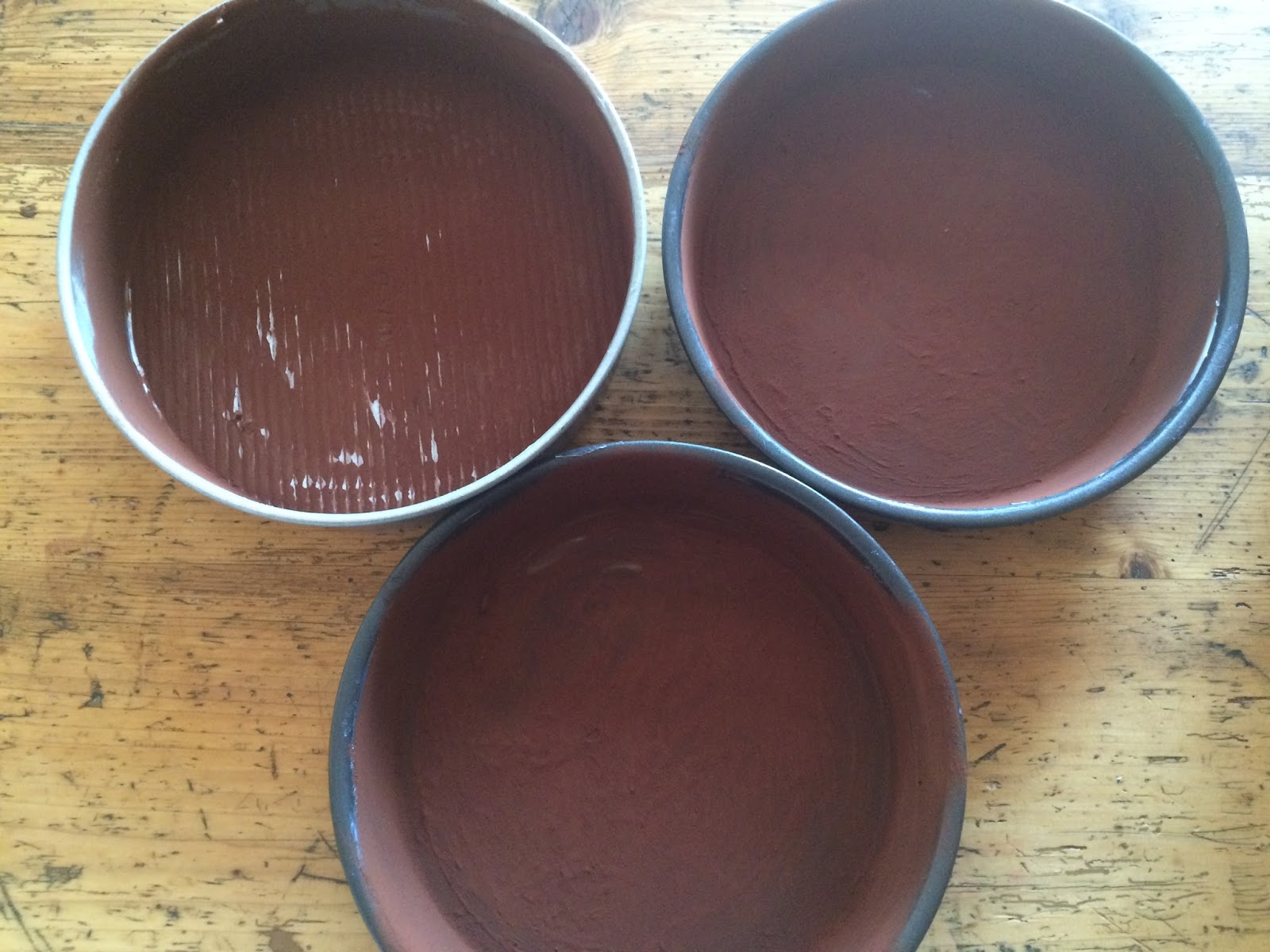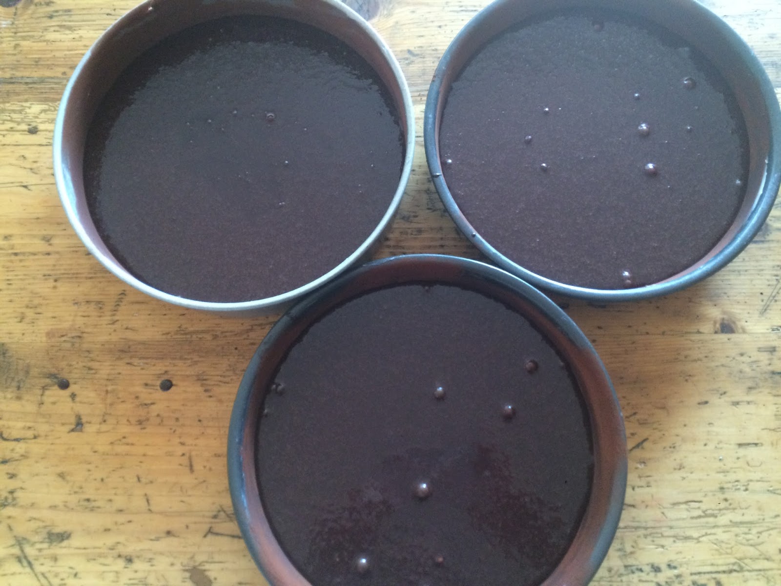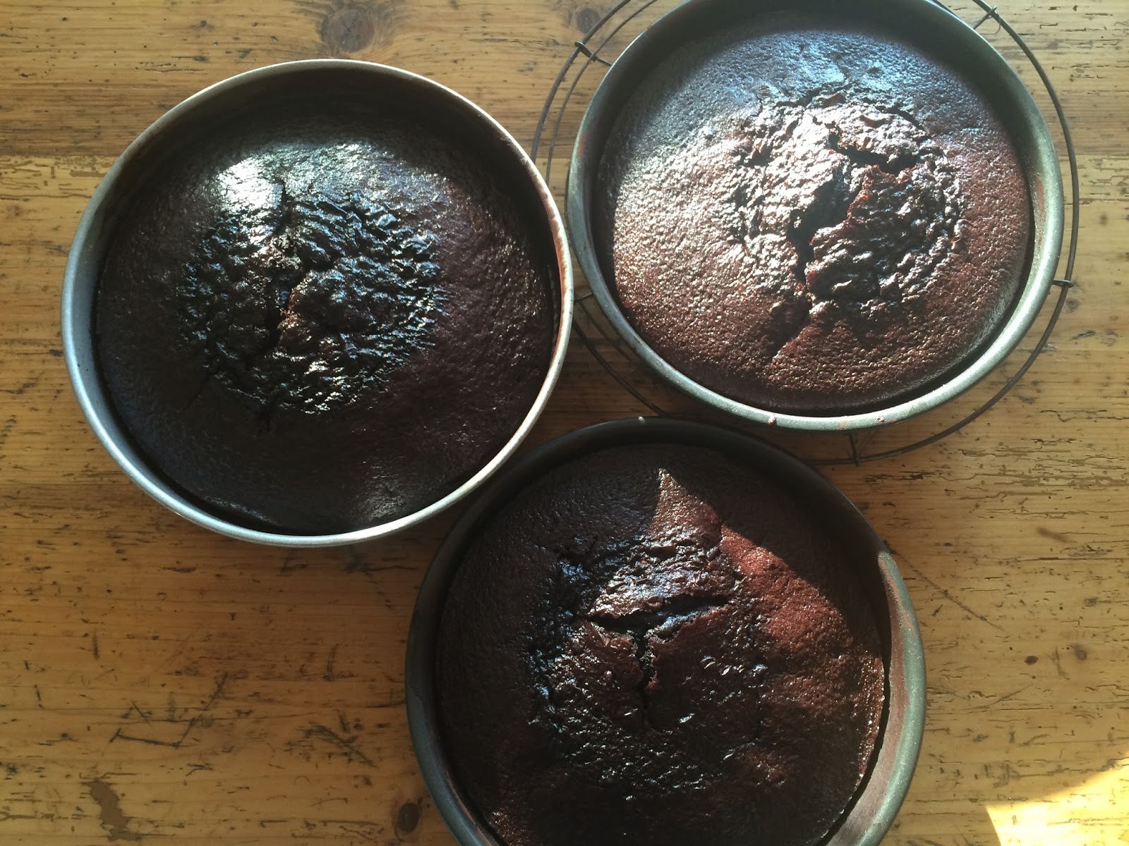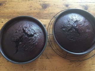 In den Formen auf einem Kuchenrost auskühlen lassen. Mit Folie abdecken und über Nacht ruhen lassen. Dann sind die Böden am nächsten Tag leichter zu verarbeiten.