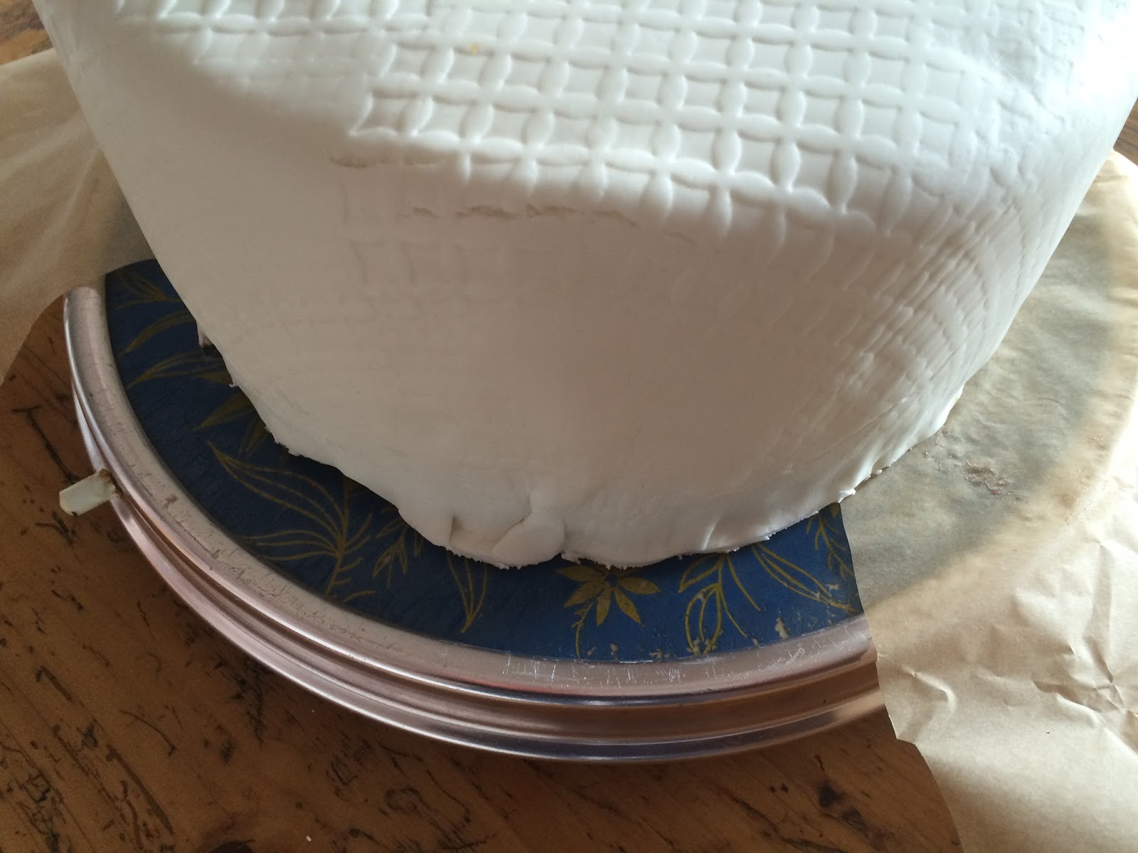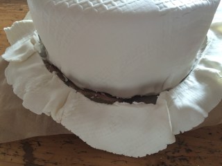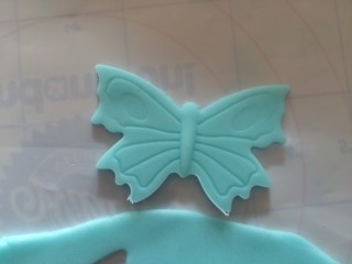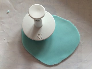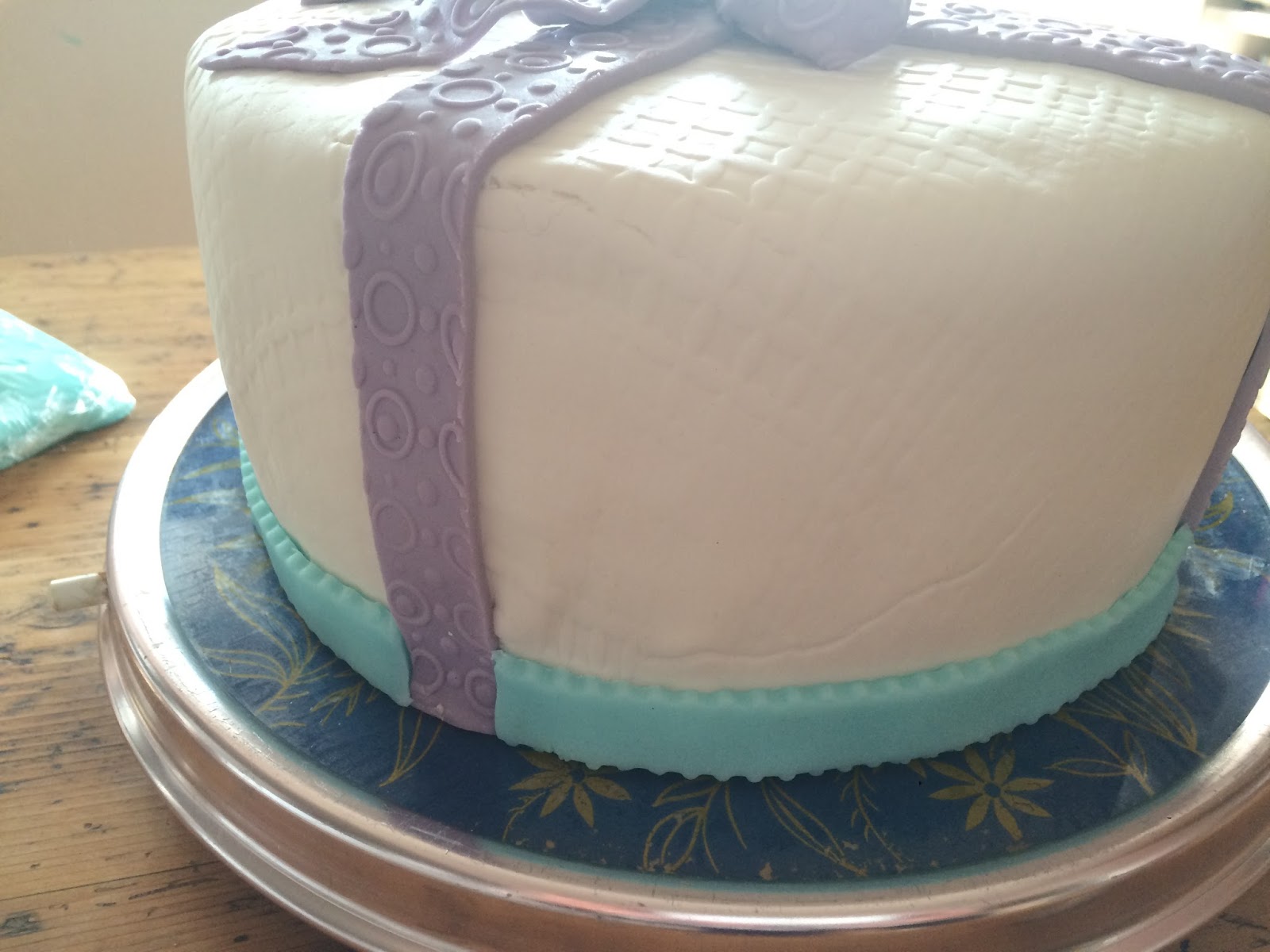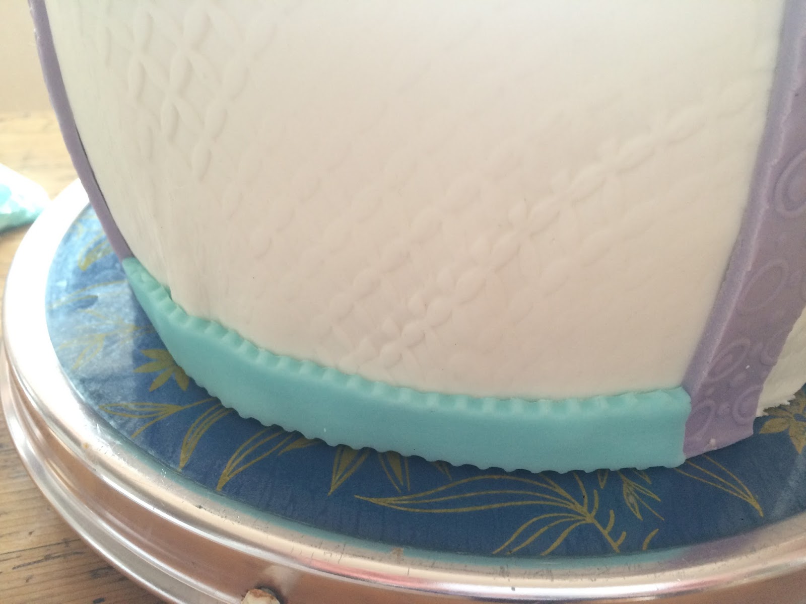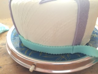 Jetzt aus dem türkisfarbenen Rollfondant Streifen für den unteren Rand ausschneiden (evtl mit Zick-Zack oder Wellenrand) und ebenso ankleben.
