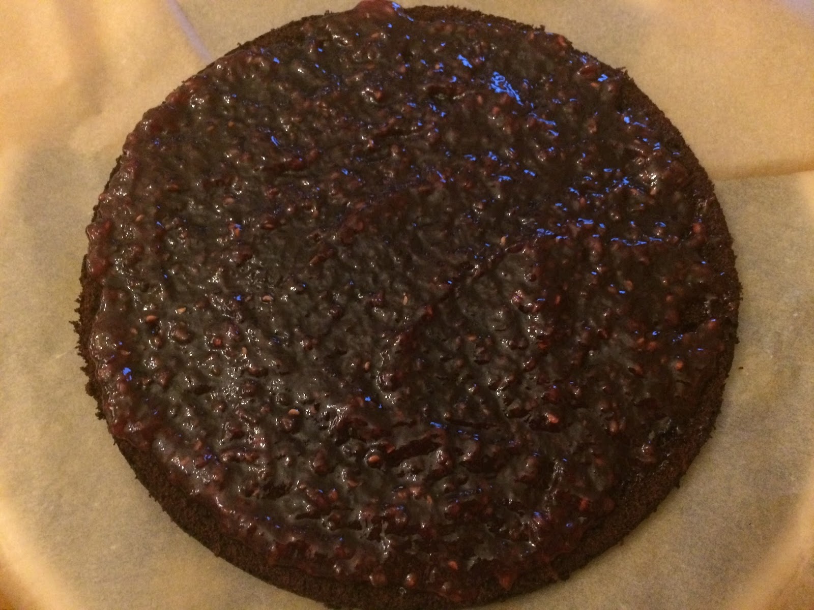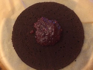 Boden mit Marmelade bestreichen. (Ihr könnt auch mit Creme beginnen. Die Reihenfolge bleibt euch überlassen. Die Creme sollte in jedem Fall reichen.)