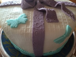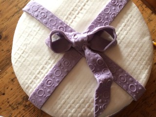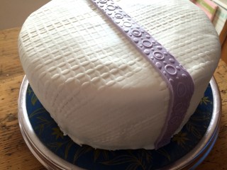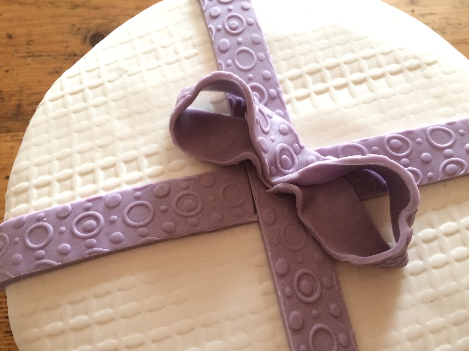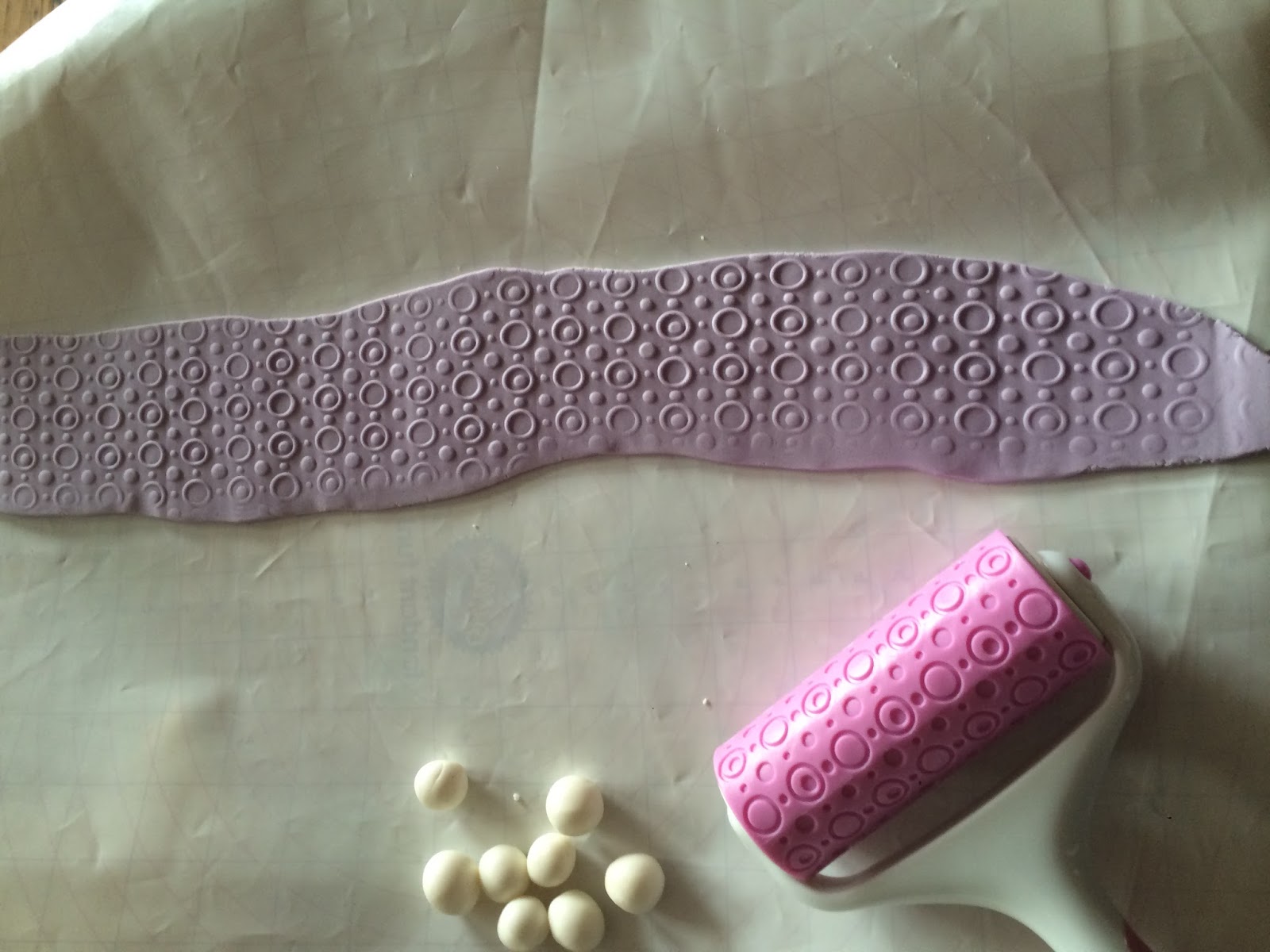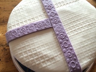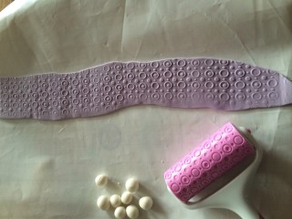 Für die Schleife lila Rollfondant geschmeidig kneten und zu einem langen Streifen ausrollen. Evtl. mit einer Strukturrolle bearbeiten….. (Die Kugeln waren eigentlich auch noch eingeplant, habe ich dann aber doch weggelassen..)