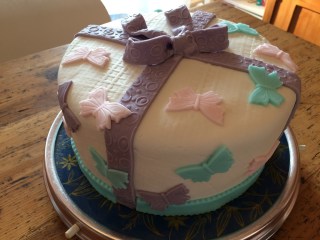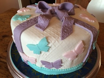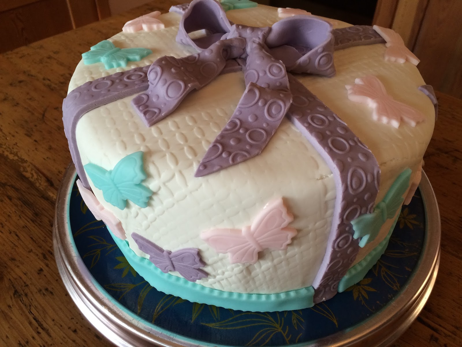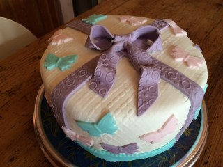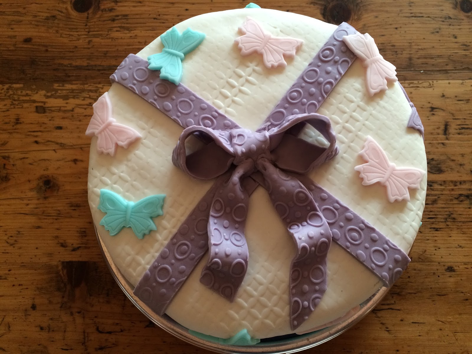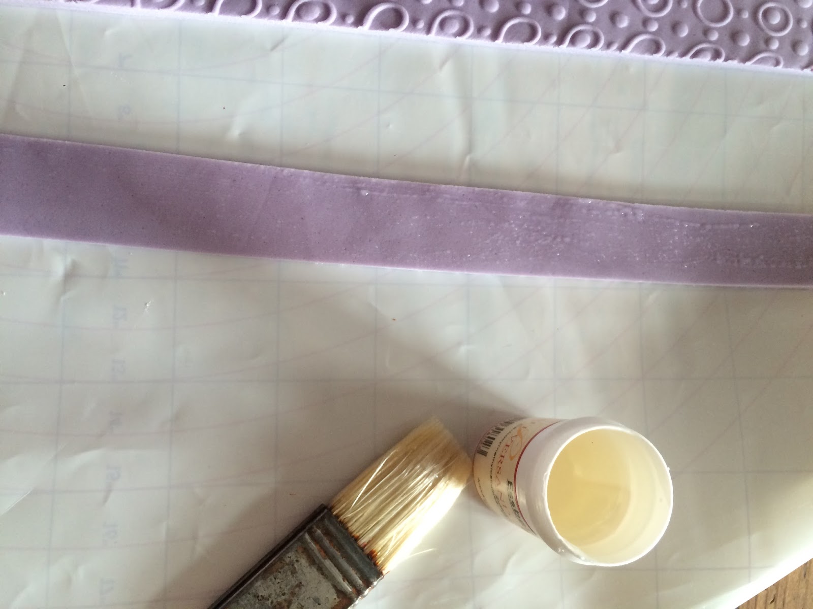 Für die Schleife lila Rollfondant geschmeidig kneten und zu einem langen Streifen ausrollen. Evtl. mit einer Strukturrolle bearbeiten….. (Die Kugeln waren eigentlich auch noch eingeplant, habe ich dann aber doch weggelassen..)