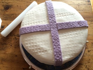 Evtl. mit einer Strukturrolle bearbeiten und vorsichtig mit beiden Händen über die Torte heben.