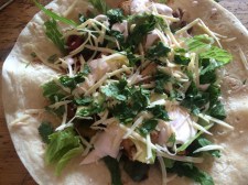 Wraps mit Hähnchen, Paprika-Zwiebel-Gemüse, Avocado, Käse und Sriracha-Sauce