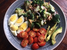 Brokkoli-Salat mit knusprigem Bacon, Käse und roten Zwiebeln